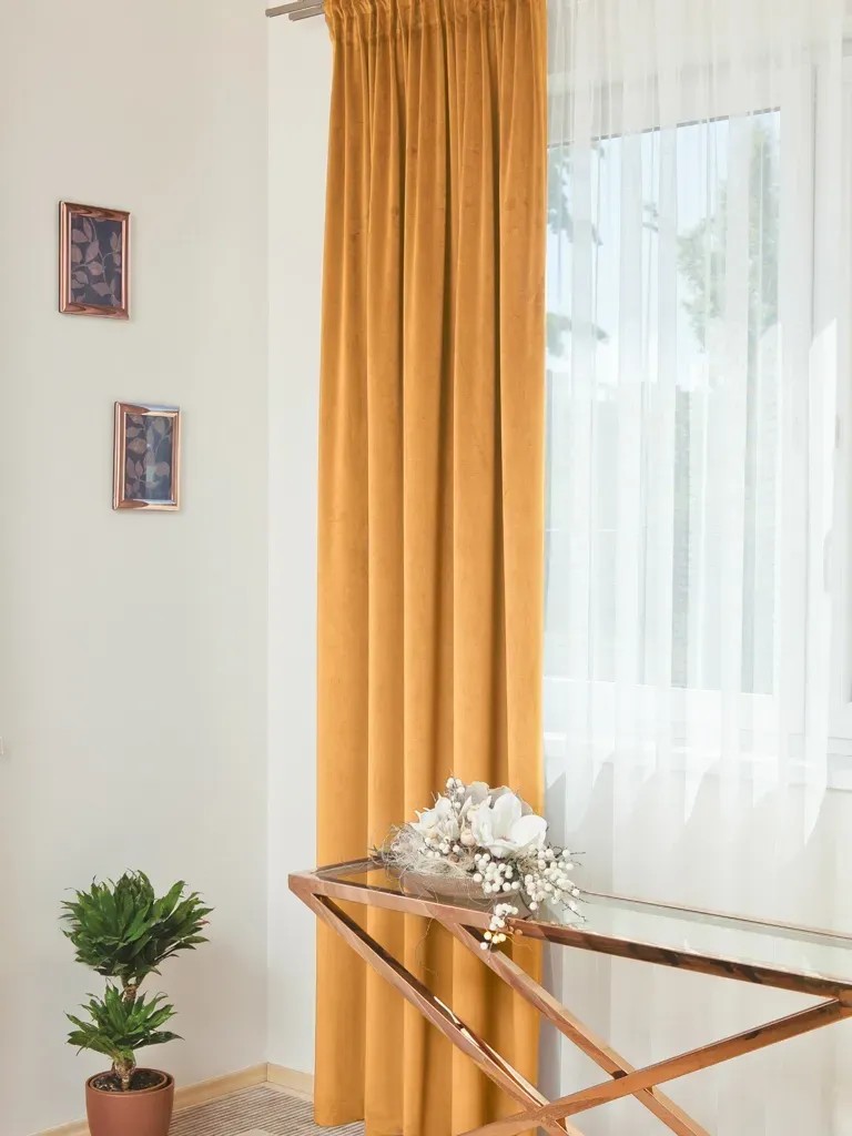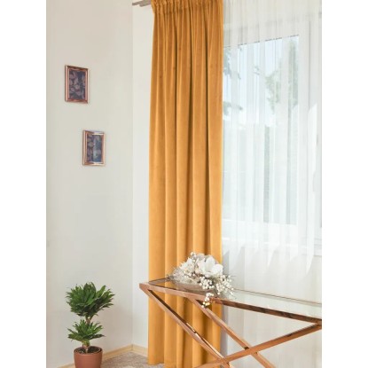 OSCAR / 11 140 cm x 250 cm okker színű dekor anyag ráncolószalaggal, összetétele 100 % poliészter.
