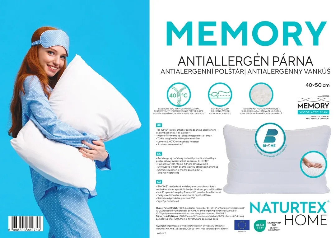 Memory antiallergén kispárna: Fedőanyag: 100% poliészter mikrofiber BI-OME® antiallergén kezeléssel. Tötet-borító: 100% poliészter, töltet-mag: 100% darált memória hab. Csak a borító mosható, a mag nem. A termék egyedi, türkiz szegővel készül és hordtáskás csomagolást kap.