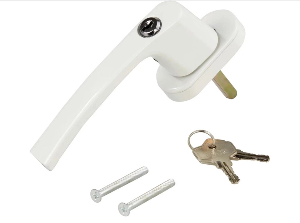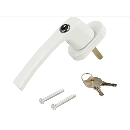 Fehér színű, alumínium alapanyagú, ablakra és erkélyajtóra is szerelhető, zárható kilincs, 1 db kulccsal.