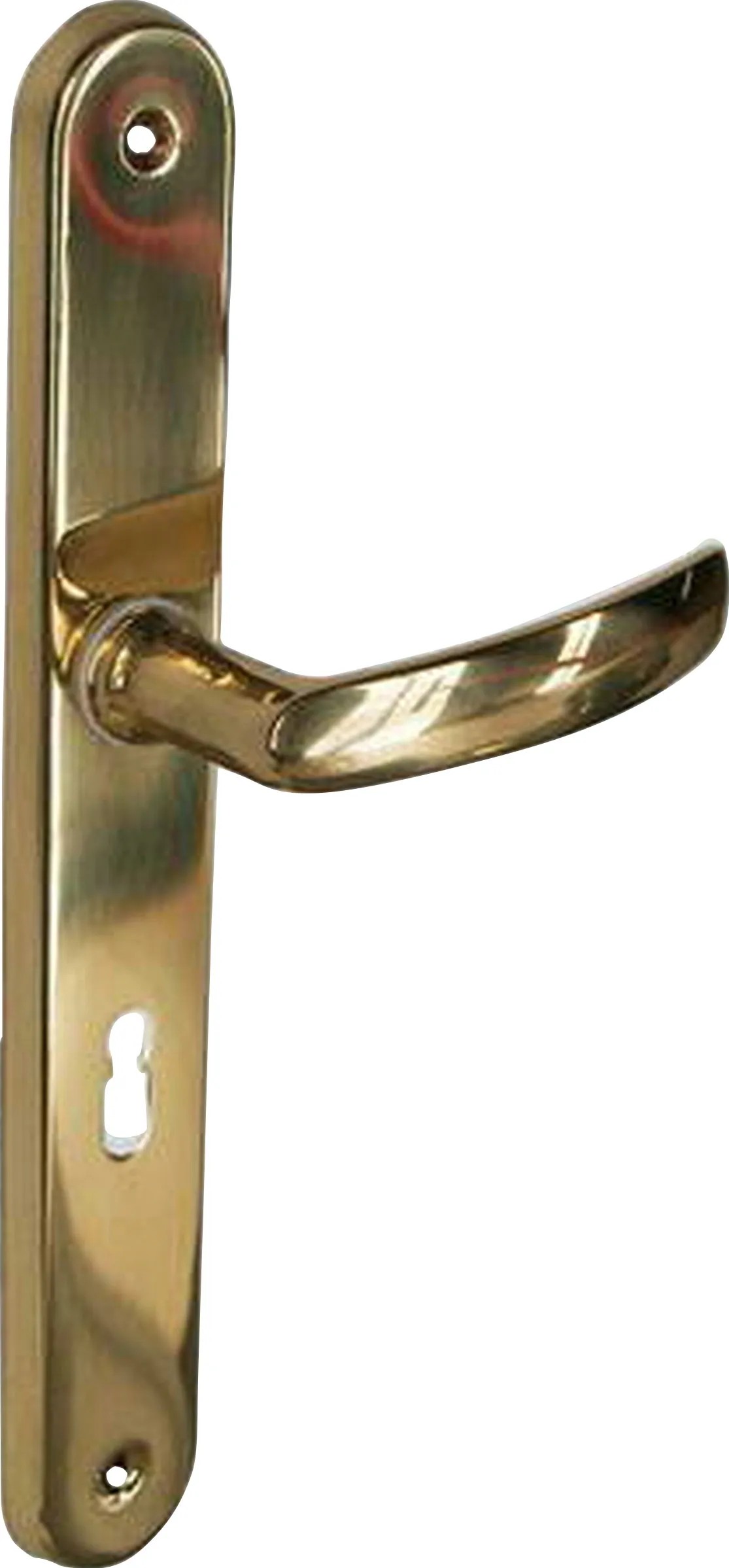 Egyszerű vonalvezetésű, rugós működtetésű ajtókilincs réz alapanyagból, lakkal védett felülettel.