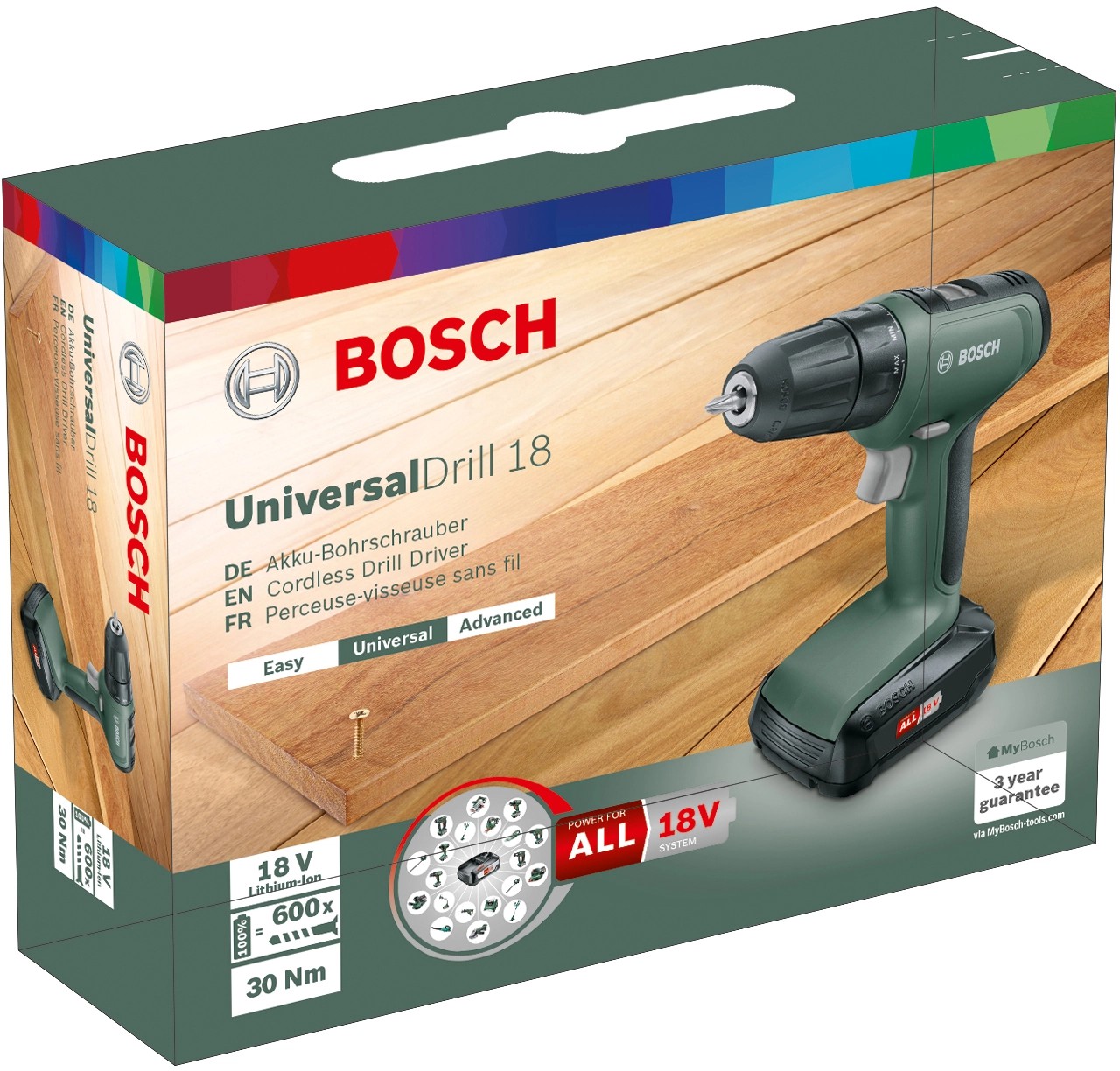 A Bosch kompakt UniversalDrill 18 akkus csavarbehajtó a csavarozási feladatok széles skáláján támogatja Önt fában és más anyagokban, valamint a bútorépítésben is. Az innovatív akkumulátoros szerszám a vezeték nélküli működésnek köszönhetően maximális mozgási szabadságot biztosít Önnek csavarozás közben, és bármikor rugalmasan használható, áramforrástól függetlenül.