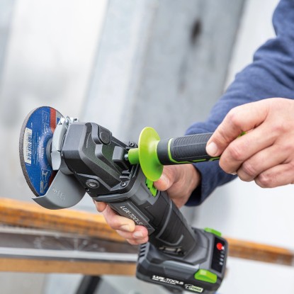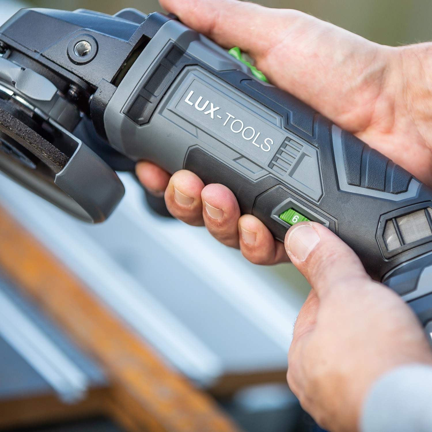 A LUX-TOOLS A-WS-20/115A akkumulátoros sarokcsiszoló professzionálisan vágja és csiszolja a fémet és a követ egyaránt. Megbízható partner a felületek rozsdamentesítésénél és az íves fa megmunkálásánál is. A sarokcsiszoló üresjárati fordulatszáma 3000-10 000 fordulat/perc. A csiszoló orsóreteszeléssel is rendelkezik. 115 mm átmérőjű csiszolókorongokhoz alkalmas. A csiszolókorong cseréjéhez szükséges tokmánykulcs a csomag részét képezi. A védőburkolat szerszám nélkül fel- és levehető a készülékről. A kellemes Softgrip markolatzónának köszönhetően az akkumulátoros sarokcsiszoló kényelmesen és csúszás nélkül vezethető végig a megmunkálási útvonalon. A kétkezes fogást szolgáló praktikus kiegészítő fogantyú rugalmas módon a készülék tetejére, jobb és bal oldalára is felszerelhető.