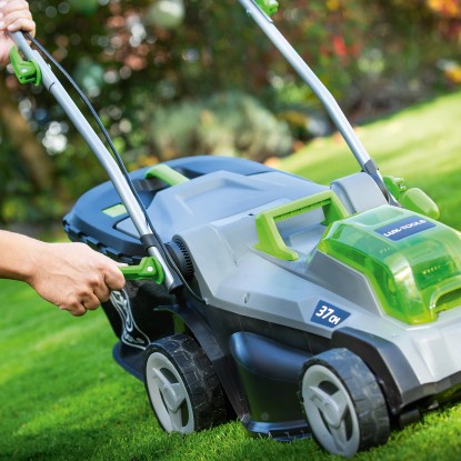 A 37 cm-es vágási szélességgel rendelkező fűnyíró legfeljebb 450 m2-es felülethez ajánlott. A központilag beállítható vágásmagasságot 25 mm és 75 mm között egyszerűen, 6 fokozatban állíthatja be.A vágásfelületre vonatkozó ajánlás arra a felületre vonatkozik, amelyen az ezzel a vágásszélességgel rendelkező fűnyírót szeretnénk használni. Nagyobb felületek esetén javasoljuk, hogy váltsanak az eggyel nagyobb modellre. 450 m2-es felület vágásához az akkumulátorokat a vágási folyamat során fel kell tölteni.