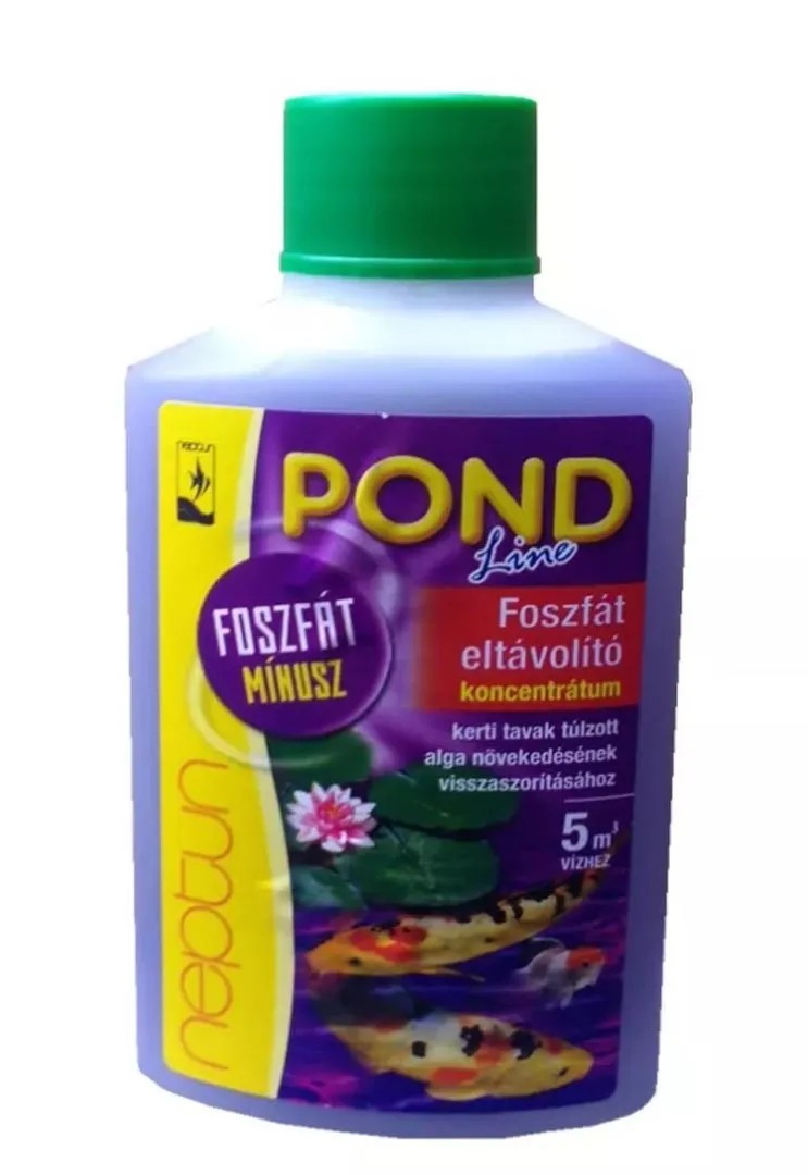 A Neptun Pond Line Foszfát Mínusz a legkorszerűbb hatóanyag tartalmú foszfát eltávolító, amely aluminium- és vas-só mentes készítmény. Az erős algásodás egyik fő oka a magas oldott tápanyagszint, melyek közül az egyik meghatározó a foszfát. Ennek szintjének csökkentésével visszaszoríthatjuk tavunkban a túlzott alga növekedést. Adagolás: 10 ml 200 liter vízhez, 250 ml készítmény 5000 liter tóvíz kezelésére elegendő. Egy kezeléssel a foszfátszint kb. 1 mg / literrel csökken. Ajánlott a szükséges mennyiséget a tó vizével felhígítva, locsolókannából egyenletesen szétoszlatni a tó vizében. Alkalmazás: Tavasszal a jég eltűnése után kezdjük alkalmazni a készítményt a túlzottan magas foszfát szint kialakulásának megelőzésére. Ajánlatos a kezelést rendszeresen havonta ismételni az első fagyok megjelenéséig. Algagátló szerrel történt kezelés után az elpusztult algáktól az oldott foszforszint megemelkedik, ezért alkalmazzuk a Neptun Pond Line Foszfát Mínuszt minden algagátlás után a megemelkedett foszfátszint csökkentésére. Kizárólag kerti dísztavakban történő használatra! A készítmény nem kerülhet felszíni vizekbe. P102. Hatóanyag: Lantán klorid heptahidráz oldata