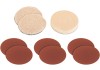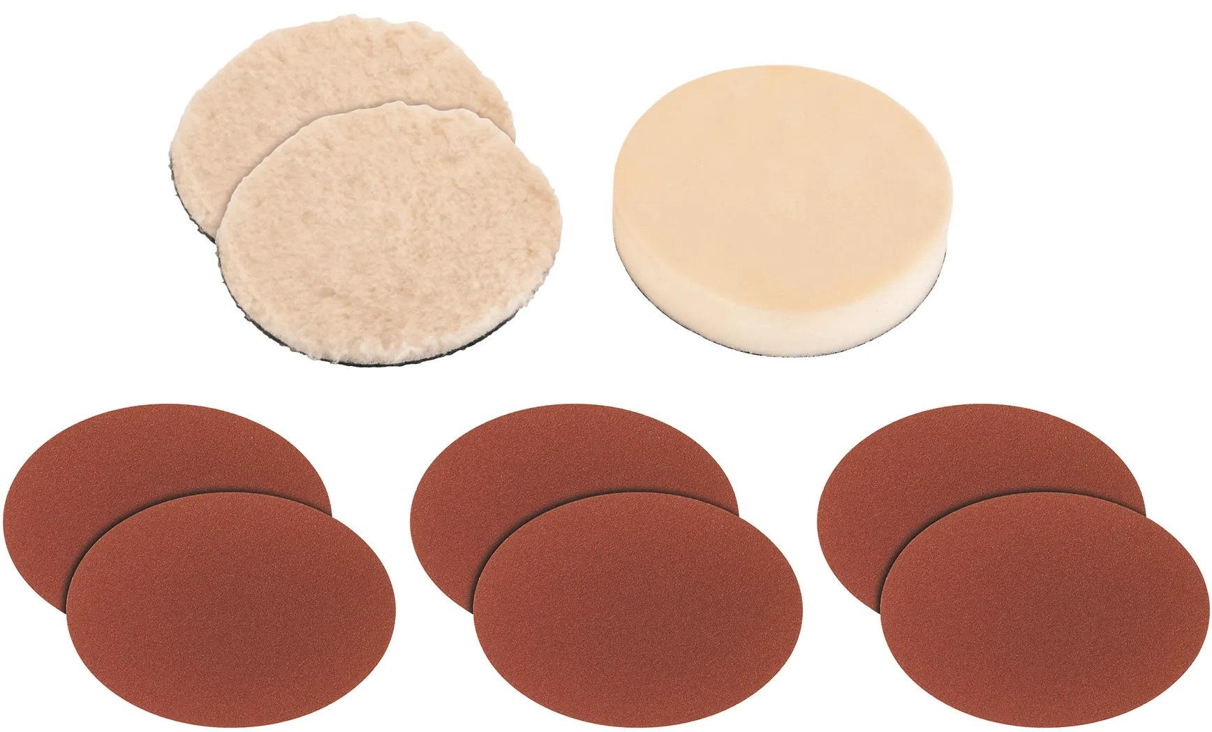A készlet tartalmaz egy habanyag feltétet, 2 szintetikus polírozó sapkát, valamint 2-2 csiszolópapírt 60-as, 80-as és 120-as szemcsemérettel.