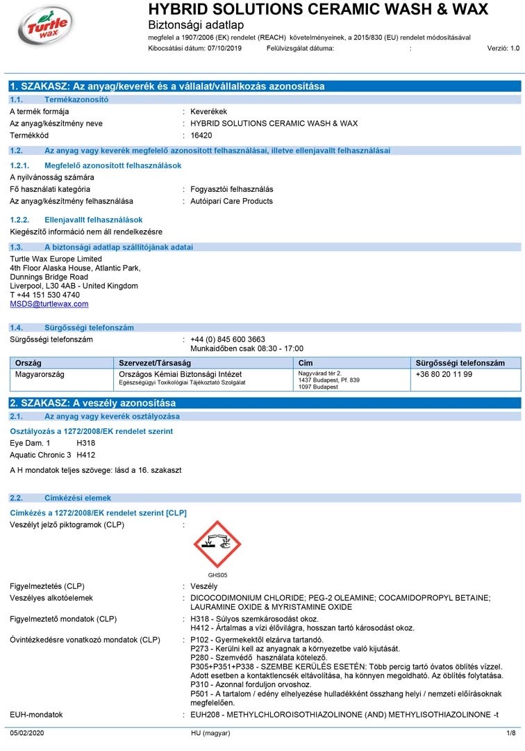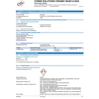 Turtle Wax kerémia autósampon és wax. Karcmentes tisztítást tesz lehetővé, hosszan védi a fényezést a vegyszerektől, növeli a szín mélységét, szuperragyogó lesz a lemosott felület. Hosszan tartó hidrofób (víztaszító) hatású lesz a felület. Használatát követően a későbbiekben rárakódott szennyeződés könnyebben eltávolítható lesz.