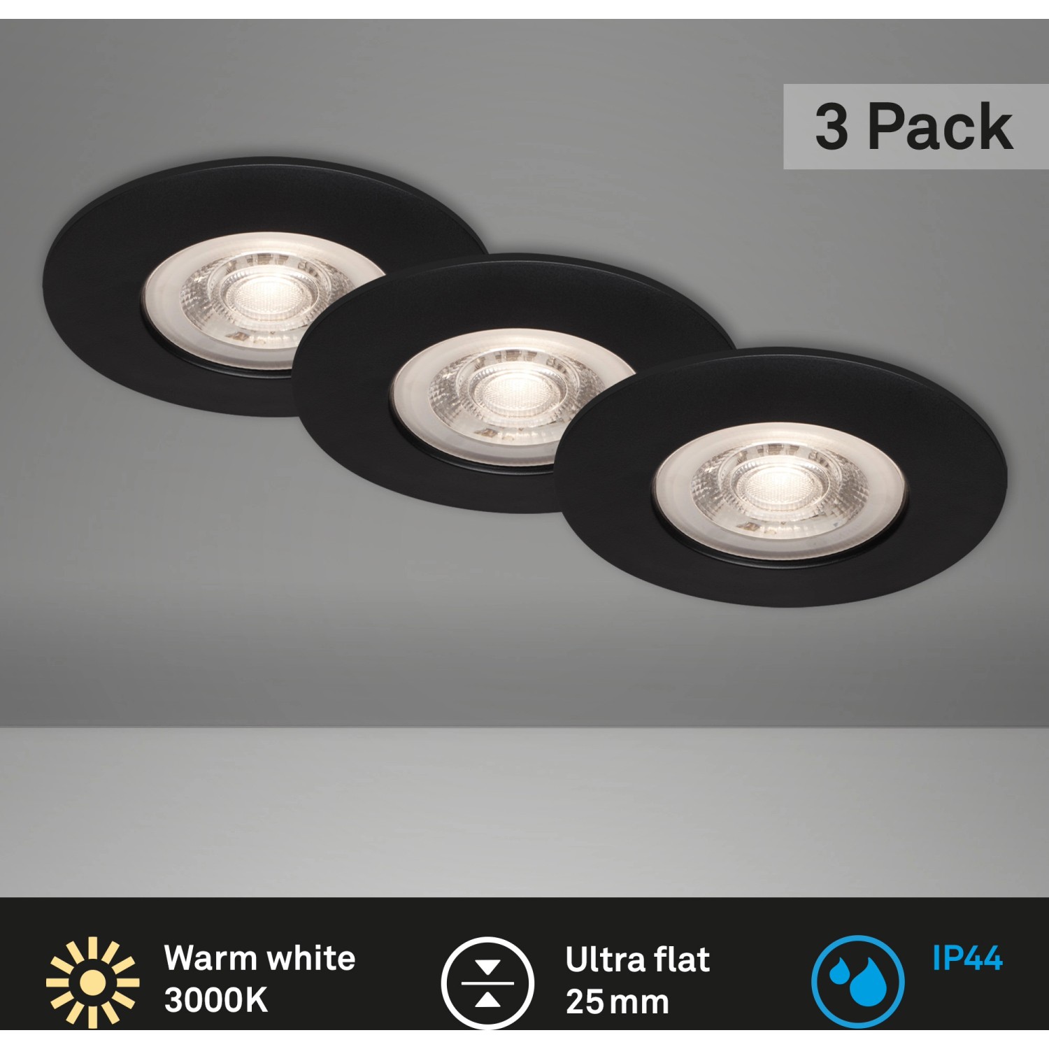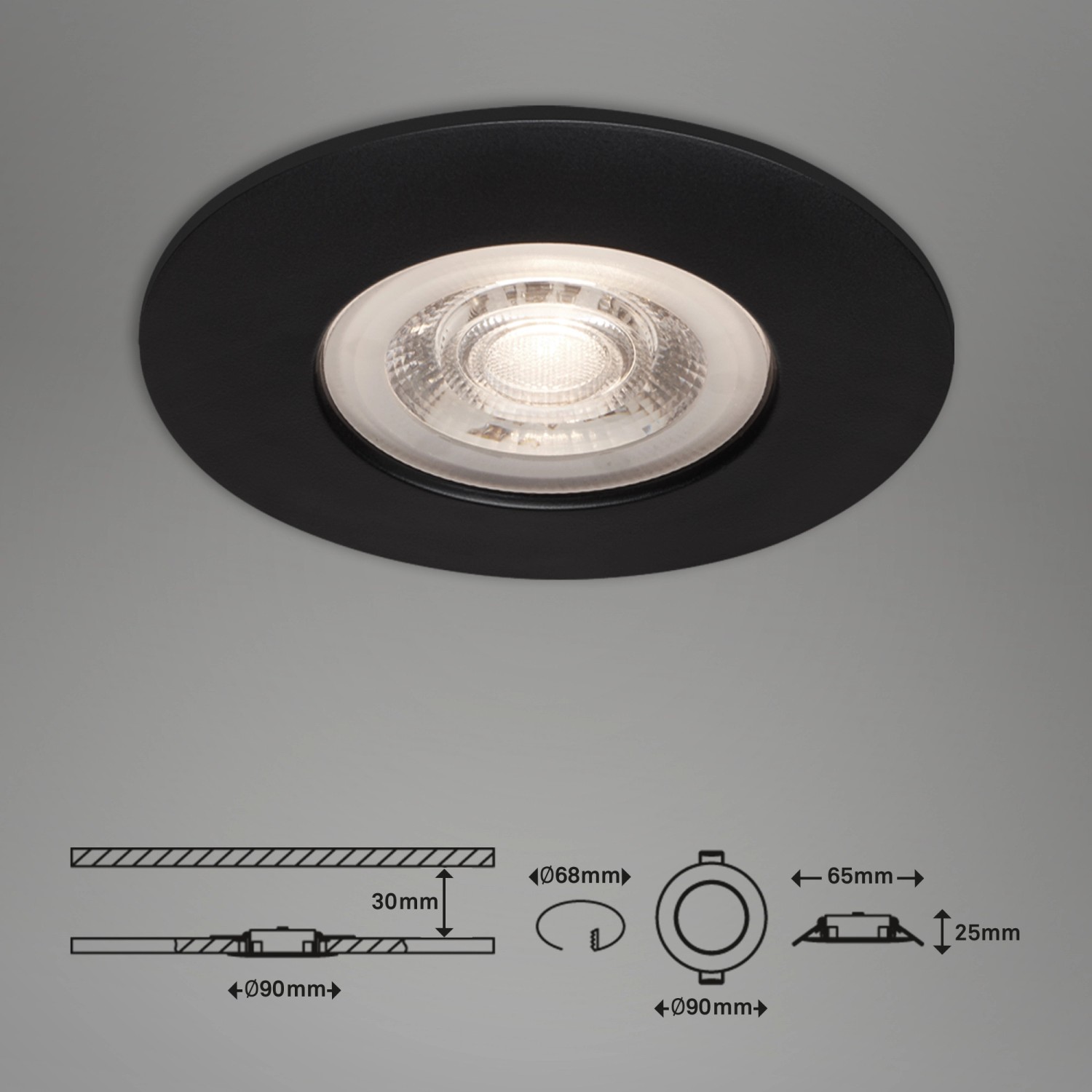 A Kulana sorozat fekete színű, ultralapos Brilo LED-es süllyesztett lámpája 5 wattos, 460 lumen fényteljesítményű, fixen beépített LED-táblával rendelkezik. A lámpa melegfehér fényszínnel rendelkezik, és IP44 védettségi osztályú, fröccsenő víz elleni védelemmel rendelkezik, ezért fürdőszobákba is alkalmas. A süllyesztett lámpa praktikus három darabos szettben kapható. A beszerelési átmérője 68 mm a beszerelési magasság pedig 30 mm.