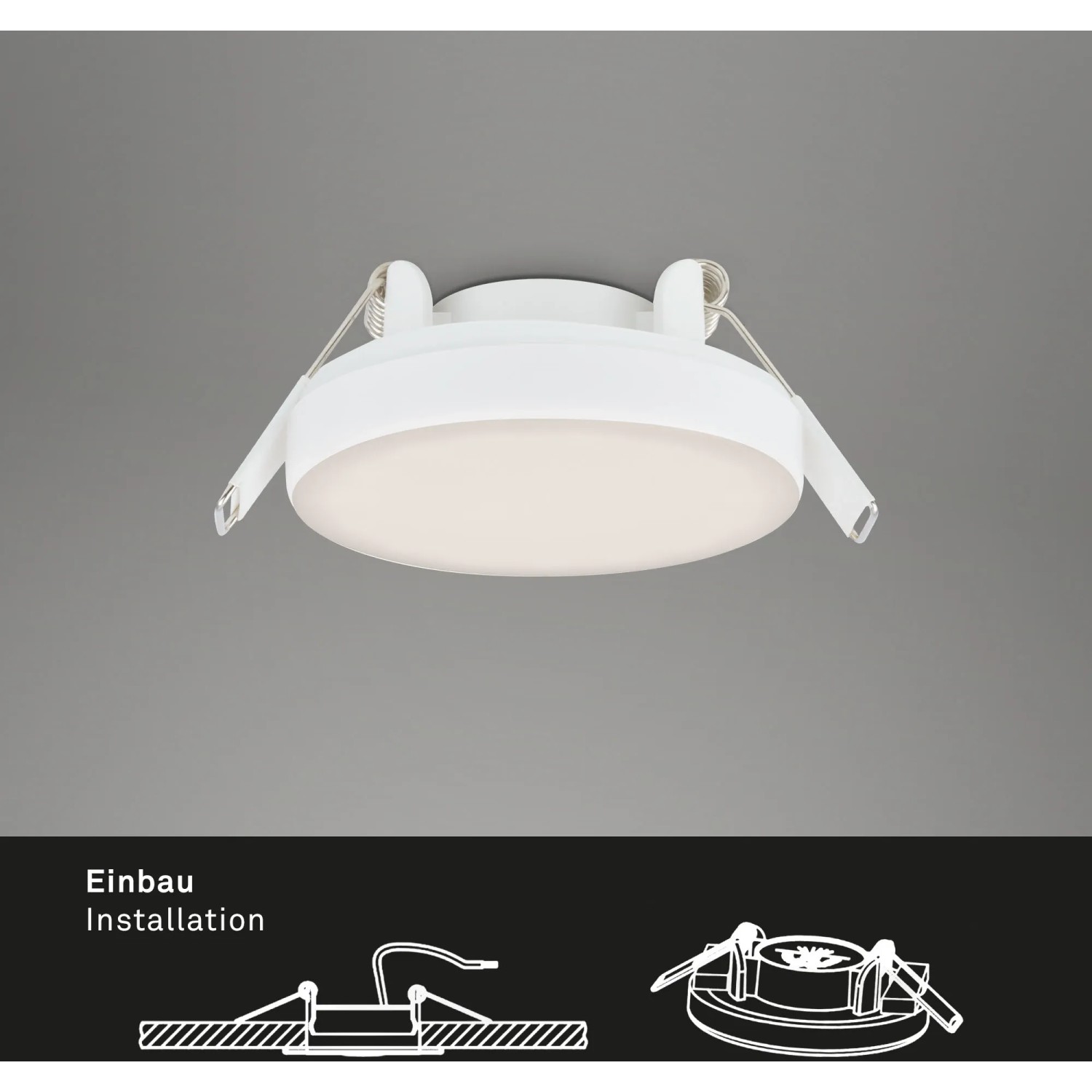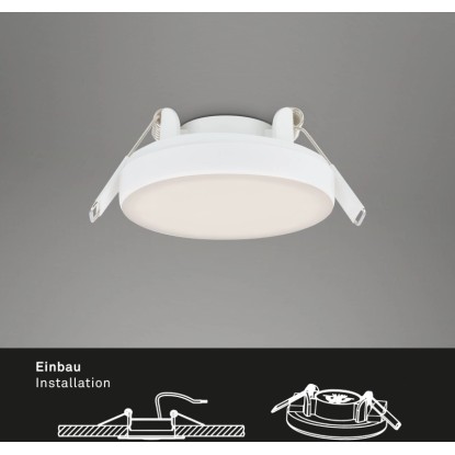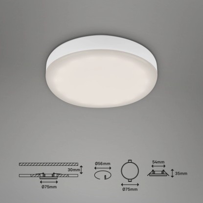 A Plat sorozat fehér színű, keret nélküli Briloner LED-es süllyesztett lámpája 3 wattos, 350 lumen fényteljesítményű, fixen beépített LED-táblával rendelkezik. A lámpa semlegesfehér fényszínnel rendelkezik, és IP44 védettségi osztályú, fröccsenő víz elleni védelemmel rendelkezik, ezért fürdőszobákba is alkalmas. A süllyesztett lámpa praktikus három darabos szettben kapható. A beszerelési átmérője 68 mm a beszerelési magasság pedig 30 mm.