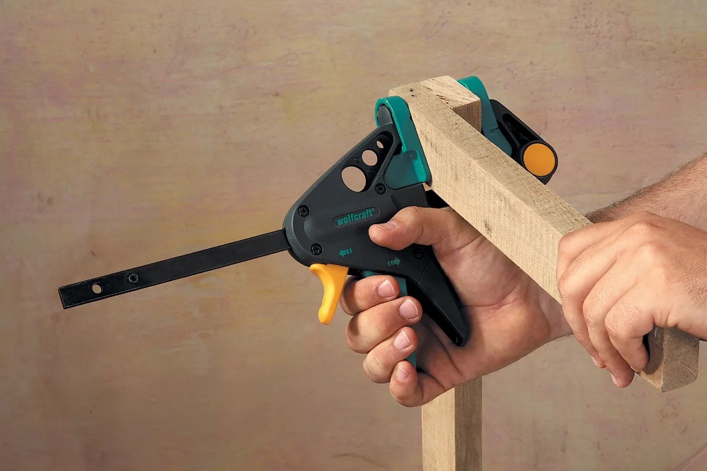 A professzionális munkálatokhoz használható Wolfcraft egykezes szorító gyors, biztos és kényelmes szorításról gondoskodik - egy kézzel is. Szorítóereje 90 kg-ig terjed, ezenkívül a legegyszerűbb kezelést garantálja, a biztos fogásról pedig az ergonomikus markolat és a csúszásmentes zóna gondoskodnak.