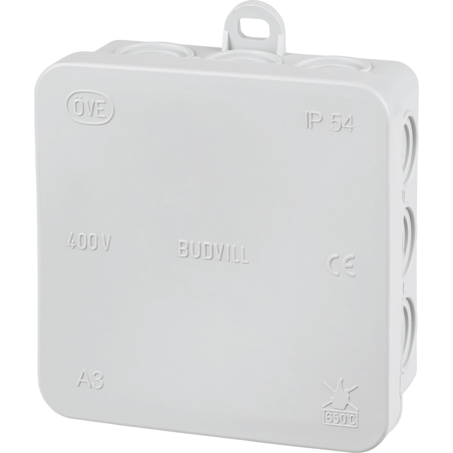 A szürke elosztódoboz falon kívüli szerelésre alkalmas. Ehhez előszerelt fedéllel és külső rögzítőpántokkal rendelkezik. A doboznak tizenkettő csatlakoztatási lehetősége van. A névleges feszültség 400 V. Az IP54 védelmi osztály révén véd a porral és fröccsenő vízzel szemben, ezáltal a szabadban való használata is lehetséges. 650 °C-ig lángálló.