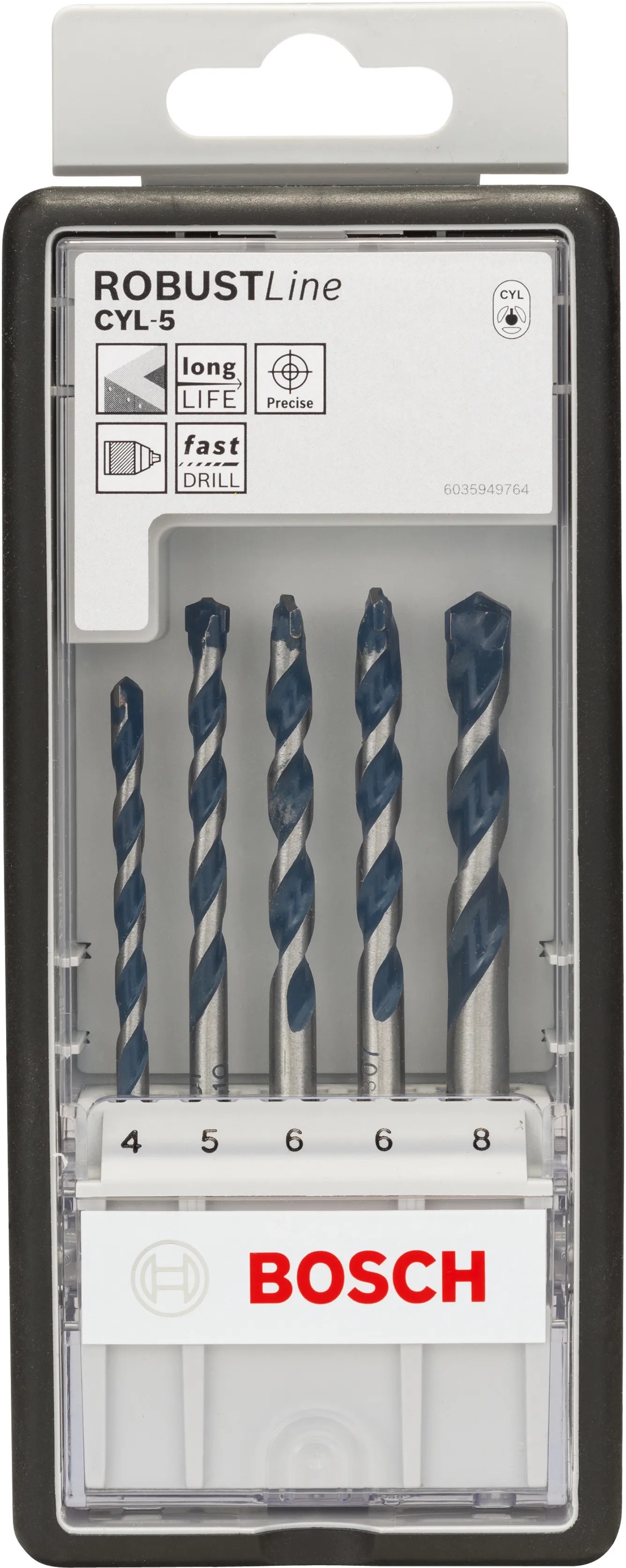 Az 5 részes Bosch Pro Robust Line betonfúrószár-készlet alkalmas gránitban, betonban, falazatban, mészhomoktéglában, termés- és műkőben történő fúráshoz. A beton fúrószár aktív központosító csúccsal rendelkezik a betonba történő aktív bemetszéshez.