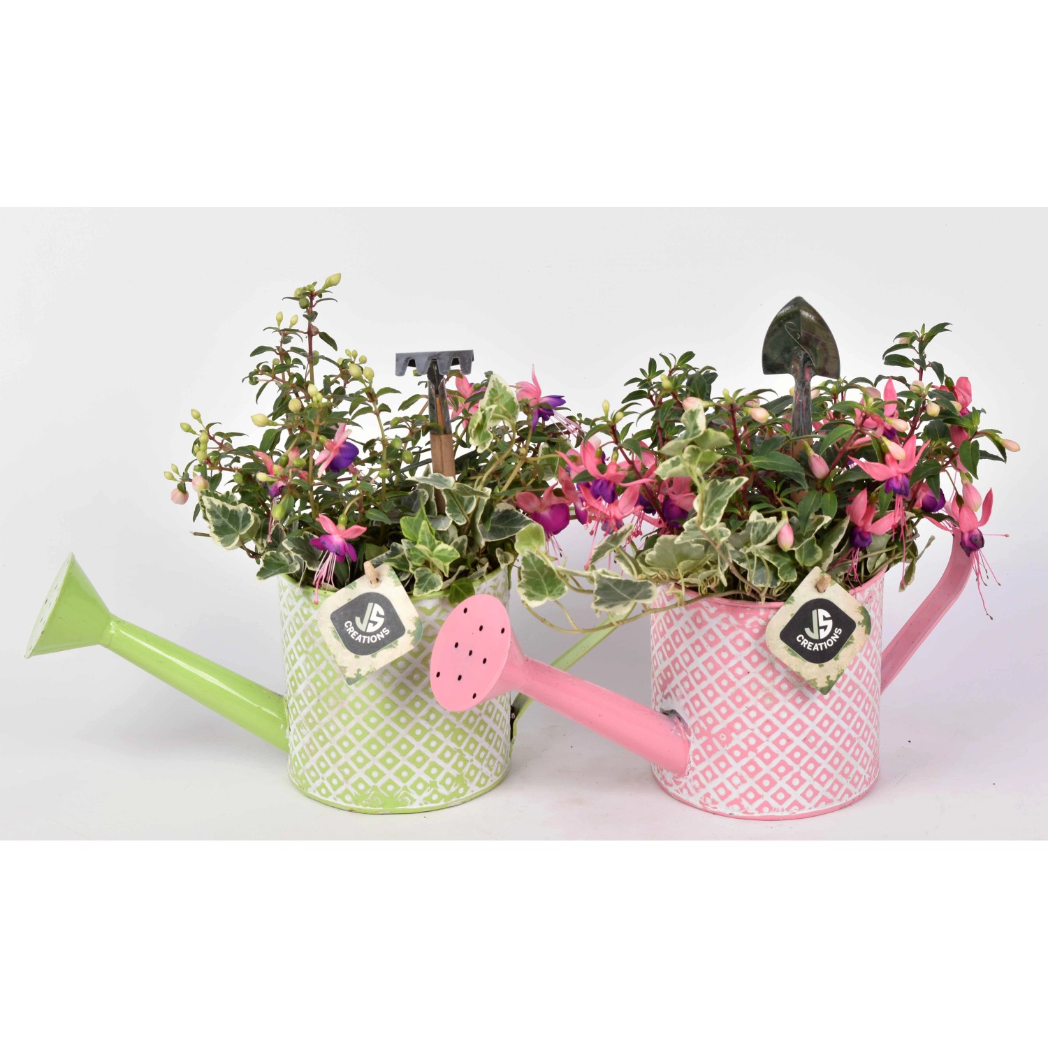 Ez a dekoratív cink öntözőkannában elhelyezett eredeti növényválogatás vonzó látványosság ablakpárkányon, balkonon vagy teraszon. A kompozícióba egy fukszia (Fuchsia) és egy borostyán (Hedera) tartozik. Tapasztalja meg azt az örömöt, hogy ezt a lenyűgöző növényt a kertjében láthatja, és élvezheti a fukszia virágzását.
