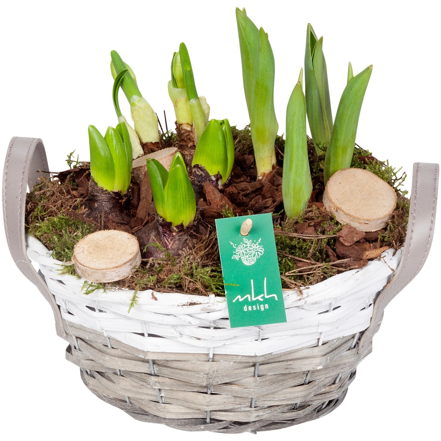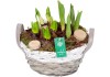 Kompozíció különböző hagymás növényekkel füles kosárban cserépátmérő: kb. 23 cm