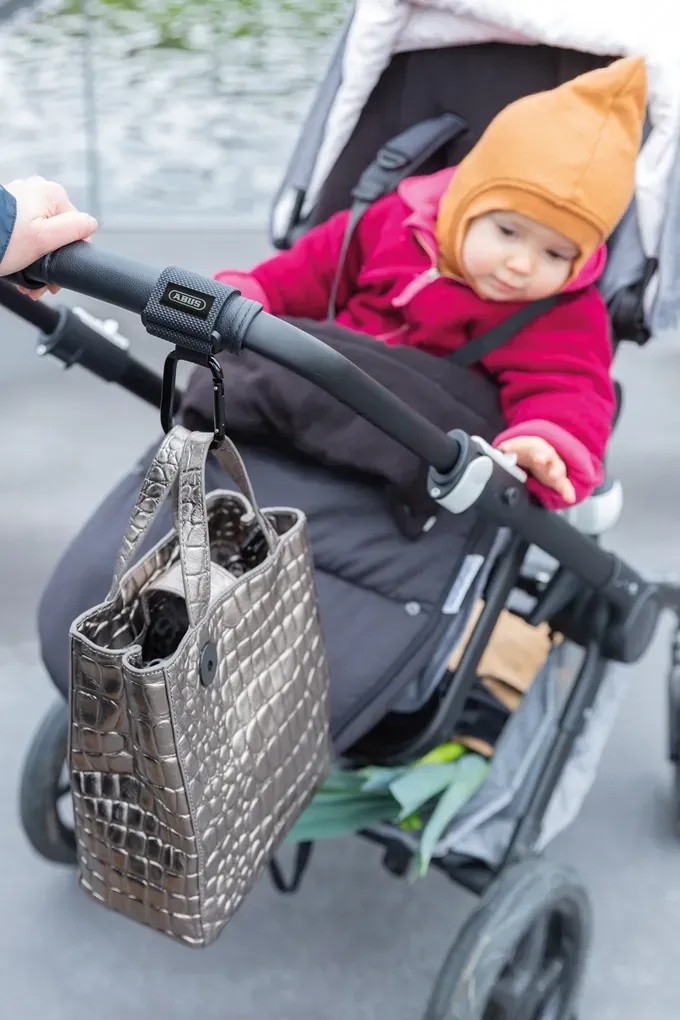 Az Abus JC6408 Hanna univerzális akasztót könnyen felszerelheti a babakocsira és a bevásárló szatyrot vagy a táskát felakaszthatja a babakocsira. Max. 35 mm-es átmérőjű fogantyúra rögzíthető a praktikus tépőzár segítségével. Akasztónként max. 8 kg-val terhelhető.