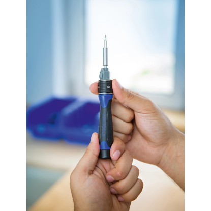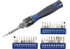 A csavarhúzó beépített hajtóművel van felszerelve, amelynek segítségével kétszer olyan gyorsan dolgozhat. Egyaránt használható bal- és jobboldali forgásirányban, csavarok meglazítására vagy meghúzására. A készlet 30 bitje három műanyag tartóba van rendezve méretjelöléssel, így mindig kéznél vannak.