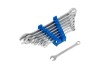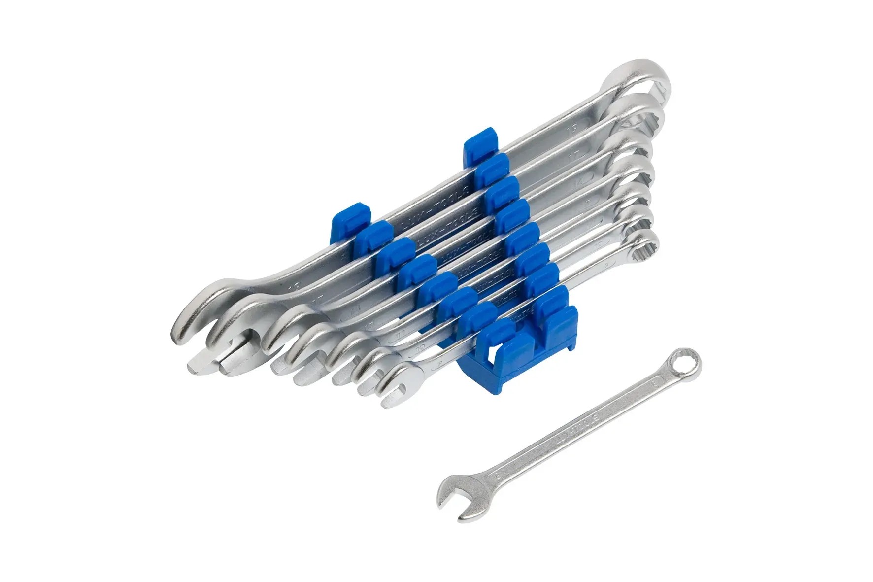 A nyolcrészes LUX-TOOLS villás-csillagkulcs készlet 8 mm, 9 mm, 10 mm, 11 mm, 13 mm, 14 mm, 17 mm és 19 mm méretű kulcsokból áll. A kulcsok króm-vanádium ötvözésű acélból süllyesztékes kovácsolással, majd edzéssel készül.