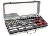 A csomagban lévő dugókulcsok befogói 6,3 mm (1/4") és 12,7 mm (1/2") méretűek, valamint különböző változatú és méretű bitekkel rendelkeznek. A csavarozókészlet króm-vanádium acélból készült, ami masszív és tartós. A kényelmes, kétkomponensű műanyag nyélnek köszönhetően a szerszámok csúszásmentesen fekszenek a kézben. Ergonomikus formái megkönnyítik a munkát. A racsnik forgatható feje jobbra és balra forgásra is beállítható.