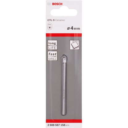 A fehér színű Bosch CYL-9 4 mm x 70 mm kerámia csempefúrószár minden puha és közepesen kemény csempéhez, porcelánhoz, kerámiához és nem edzett üveghez alkalmas. A fúró hosszú élettartamú keményfémből áll a hosszú élettartam és az ellenállóság érdekében. A megerősített fej tovább növeli a fúró élettartamát. A központosító csúcs biztosítja a precíz fúrást, mert nem csúszik el a fúró..