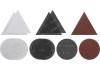 A gipszkartoncsiszolókhoz használható kwb by Einhell tartozékkészlet 15 darabot 3 különböző csiszolópapírból és -rácsból 225 mm-es átmérővel, illetve 287 mm-es élhosszal. Ezek mikro tépőzárral rögzíthetők a csiszolótányérra. A csomag 5 darab háromszögletű