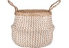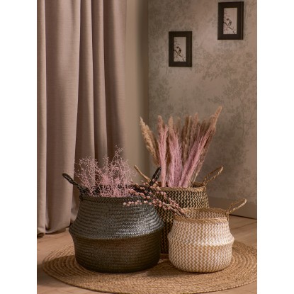 A Minimalist Zen trendkollekcióba tartozó kompakt tárolókosár dekorációs elemként sokoldalúan beilleszthető a nappali vagy az étkező környezetébe. Használható egyúttal kisebb tárgyak elhelyezésére vagy kézimunkás kosárként is. Két színből, a természetes barnából és a fehérből váltakozva fonott anyaga természetes hínárból áll. Ennek köszönhetően elegáns japán stílusú mintázattal rendelkezik. A dekoratív kosár kerek formáját a zsinórból készült két fogantyúk teszik teljessé, amelyek a szállítást is segítik. 25 cm-es átmérőjével és 30 cm-es magasságával a rendrakáshoz használt segítőtárs mindenhol megtalálja a helyét.