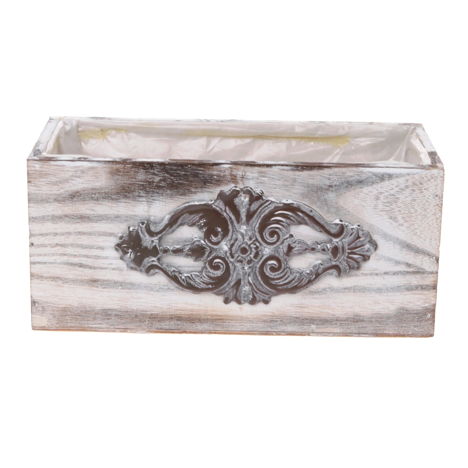 A natúr-fehér-mosott kialakítású, fém díszítésű fa virágtartó négyszög alakú, és virágládaként, kaspóként vagy virágcserépként egyaránt használható. Belül fóliával van kibélelve. Méretek: 25 cm x 11 cm x 11 cm.
