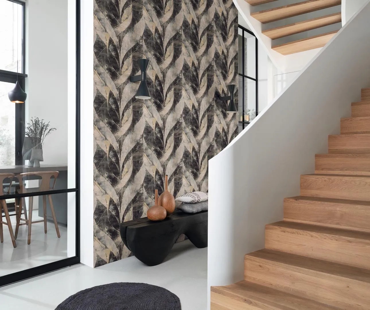 Ez a háromdimenziós hatású, egymásba fonódó grafika, mintha önmagában rabul ejtené a néző tekintetét. Az extravagáns szerkezetnek és a matt arany finom csillogó felvitelének köszönhetően ez a világos bézs tónusú vlies tapéta pillanatok alatt elegánssá és élettel telivé varázsol minden otthont.