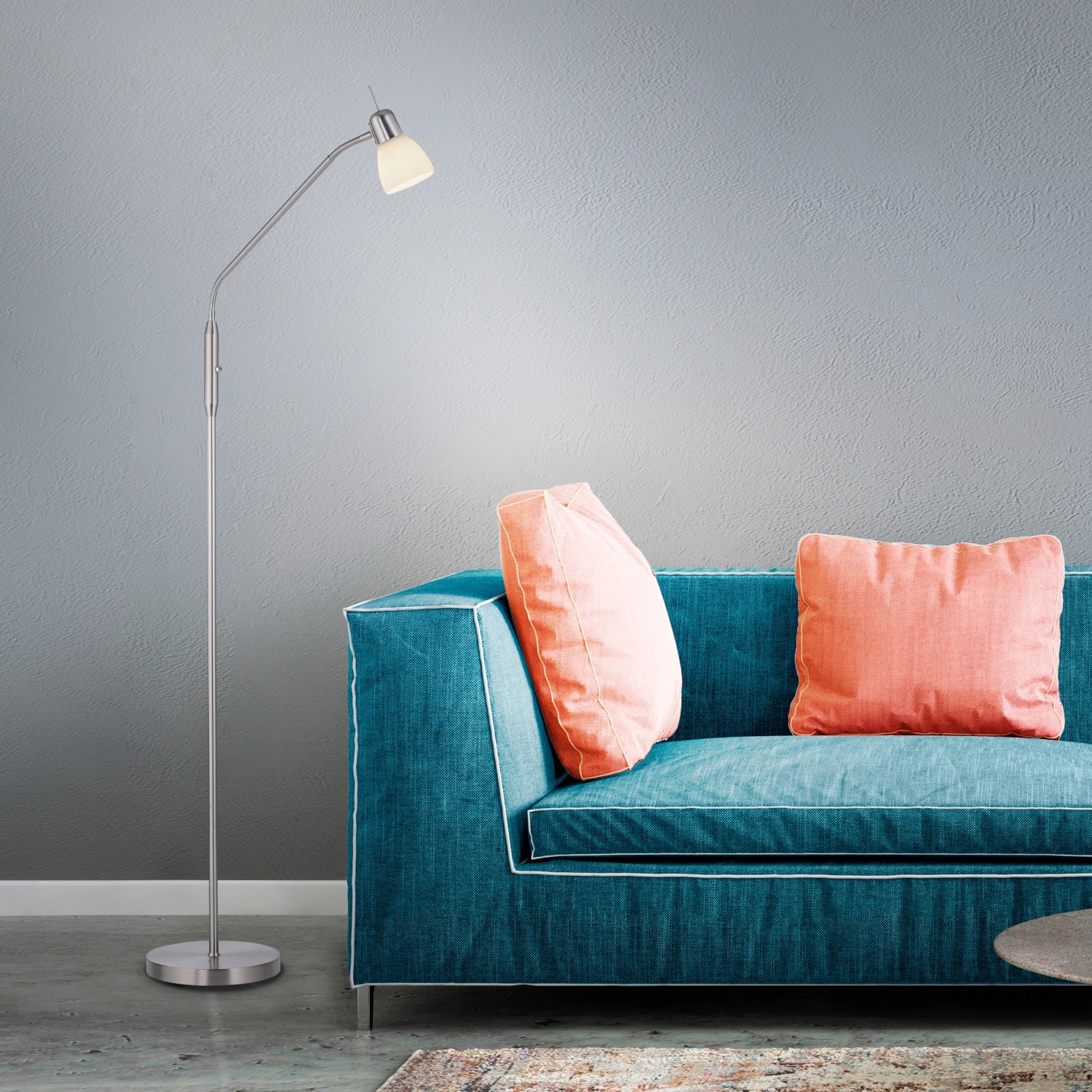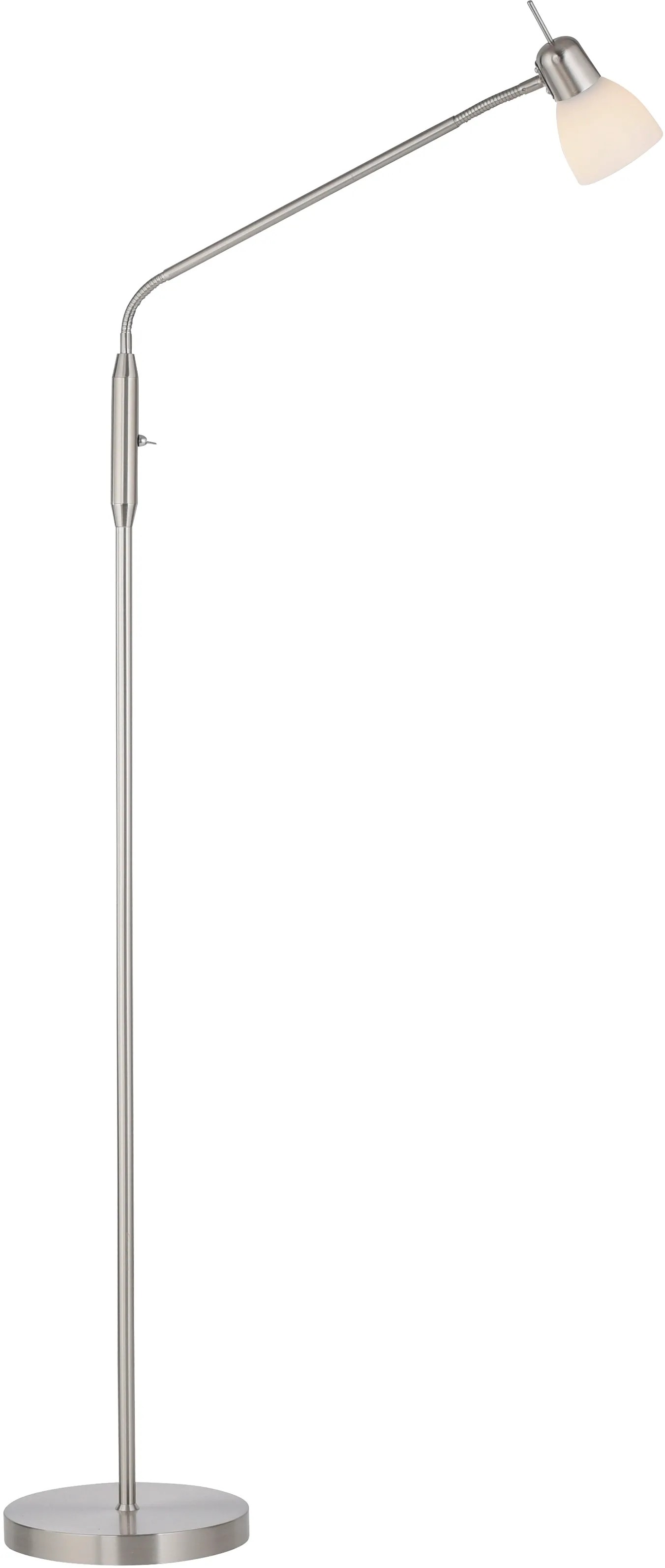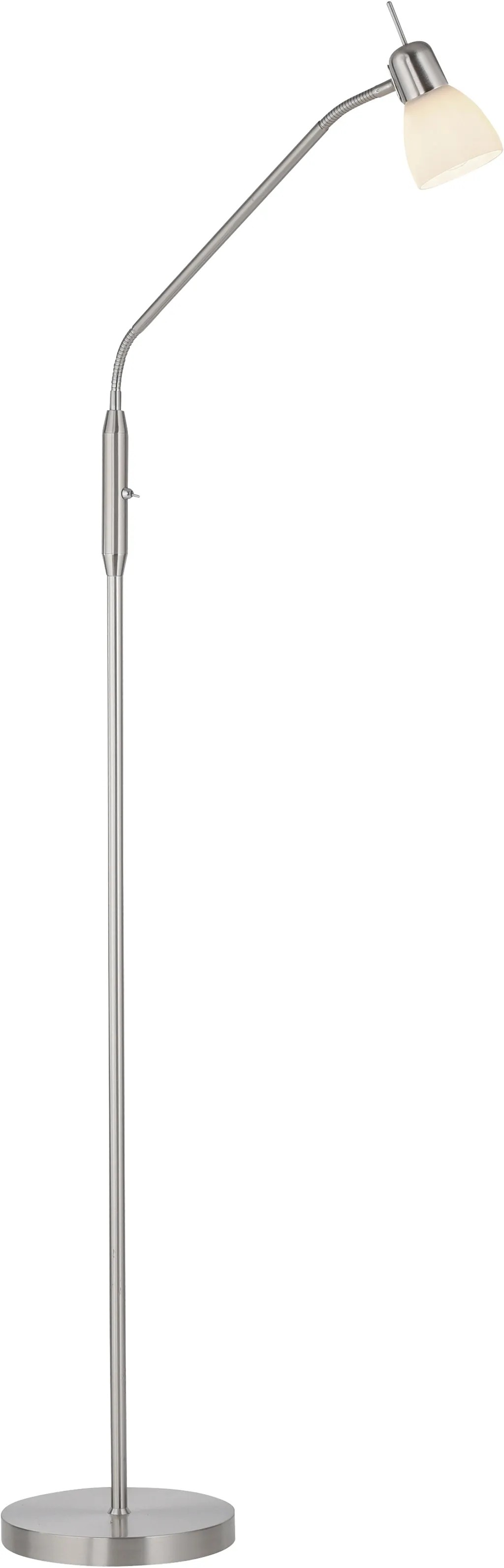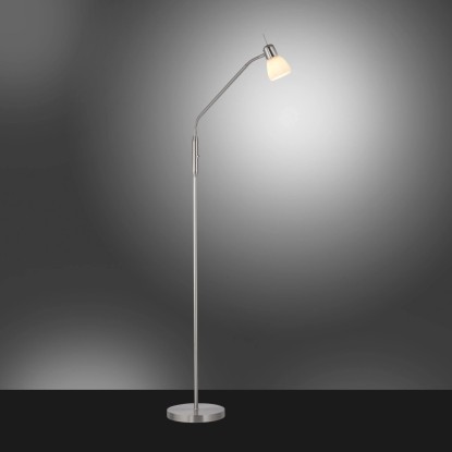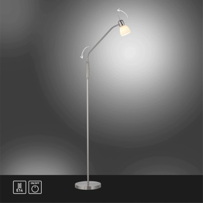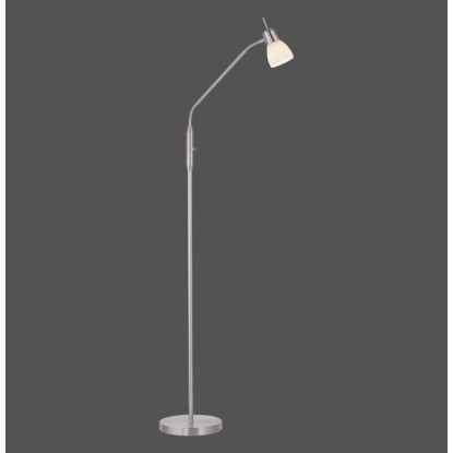 Az acélszínű Karo állólámpa egyszerű és időtlen kialakításával hódít. A matt fehér opálüvegnek köszönhetően a lámpa gyönyörű és vakításmentes fényt bocsát ki. A lámpa egy max. 40 wattos E14-es izzóval használható. Az állólámpa rugalmas kialakítású felső részének köszönhetően az ernyő a kívánt irányba és magasságba forgatható. A billenőkapcsolóval az állólámpa kényelmesen be- és kikapcsolható. A lámpa hosszúsága és szélessége 50 cm, magassága pedig 118 cm - 159 cm.