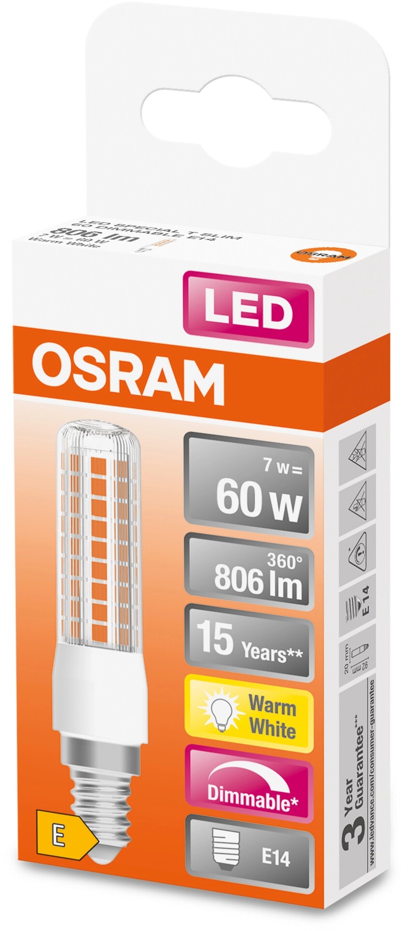 Classic Osram LED-lámpa T alakú átlátszó dimm. E14 / 7,5 W (806 lm) melegfehér