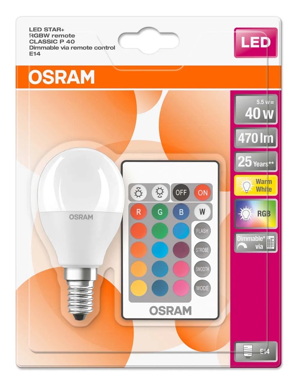 OSRAM Star+ RGBW távirányítható LED kisgömb, matt búra, 5,5 W 470lm 2700 K E14, átlagos élettartam: 25000 óra, fényszín: meleg fehér, sugárzási szög: 200 fok, energiaosztály: F, fényhasznosítás: 85 lm/W, kapcsolásszám: 100000, kiváltott hagyományos izzó: 40 W, termék hossza: 91 mm, termék átmérője: 47 mm