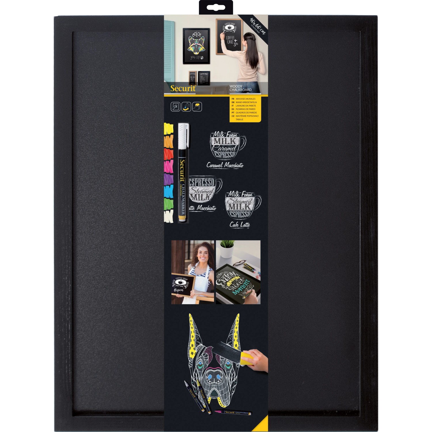 40 cm x 60 cm-es krétatábla fa kerettel és mindkét oldalon írható felülettel. A csomag ajándék fehér krétamarkert tartalmaz. A tábla krétamarkerrel írható és nedves ruhával törölhető. Reklámhordozónak, információs táblának, dekorációnak, egyaránt kiváló. Használható otthon, irodában, üzletben, étteremben, hotelekben, oktatási intézményekben stb.