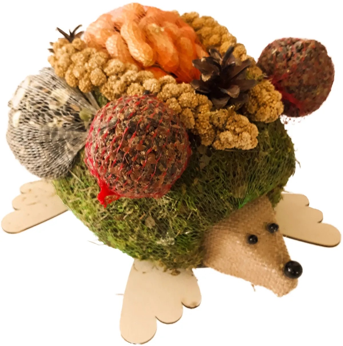 A madáretető sündisznó kedves kerti dekoráció. Ez az aranyos sündisznó természetes anyagokból, pl. moha, fa és toboz, áll. A sündisznó mogyorót és magvakat tartalmazó zacskókkal és kölesrudakkal felszerelt, így lesz belőle madáretető. Cinkék, verebek és pintyek gondoskodnak a madáretető körüli nyüzsgésről.