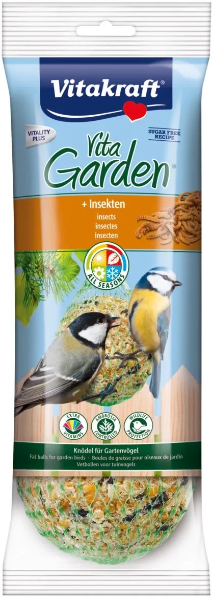Az állati fehérjékkel és az ízletes magokkal ez a finom golyó optimálisan egészíti ki a kerti madarak természetes étrendjét. A kíméletes előállításnak köszönhetően még egyértelműen felismerhetők az egyes összetevők, és az állatok jól, maradékok nélkül fel tudják csipegetni ezeket. Az értékes zsír energiát ad a madaraknak, ráadásul az eleség nedvesség miatti megromlását is megakadályozza. Ezenkívül a Vita Garden® golyók minden kerti madarat ellátnak fontos vitaminokkal. Nagyobb változatosság a táplálékkeresés során!