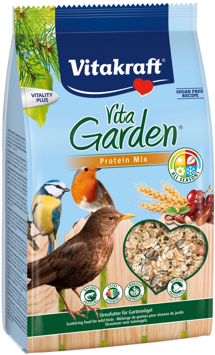 A vadmadarak számára egyre nehezebb, hogy elegendő táplálékot találjanak a természetben. Az egész éves etetés sok faj állományának fenntartásában segíthet, aktívan hozzájárulva ily módon a madárvédelemhez. Etesse Ön is a madarakat, és csodálja meg ezeket a tarka állatokat a saját kertjében! A Vita Garden madáreledel értékes kiegészítője a természetben megtalálható eleségeknek. A magok, datolyák, mazsolák és mogyorók prémium keveréke értékes állati fehérjéket tartalmaz, és minden kerti madarat az élethez szükséges tápanyagokkal és fontos vitaminokkal lát el. Nagyobb változatosság a táplálékkeresés során!
