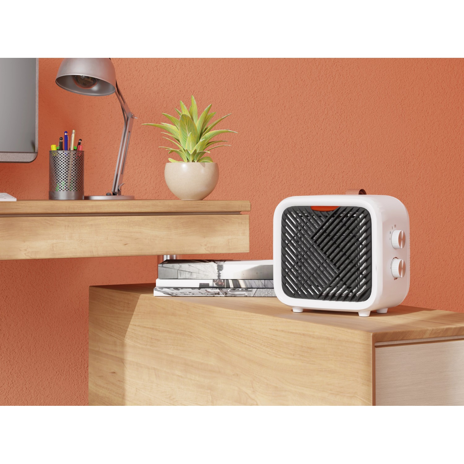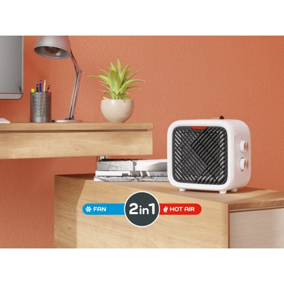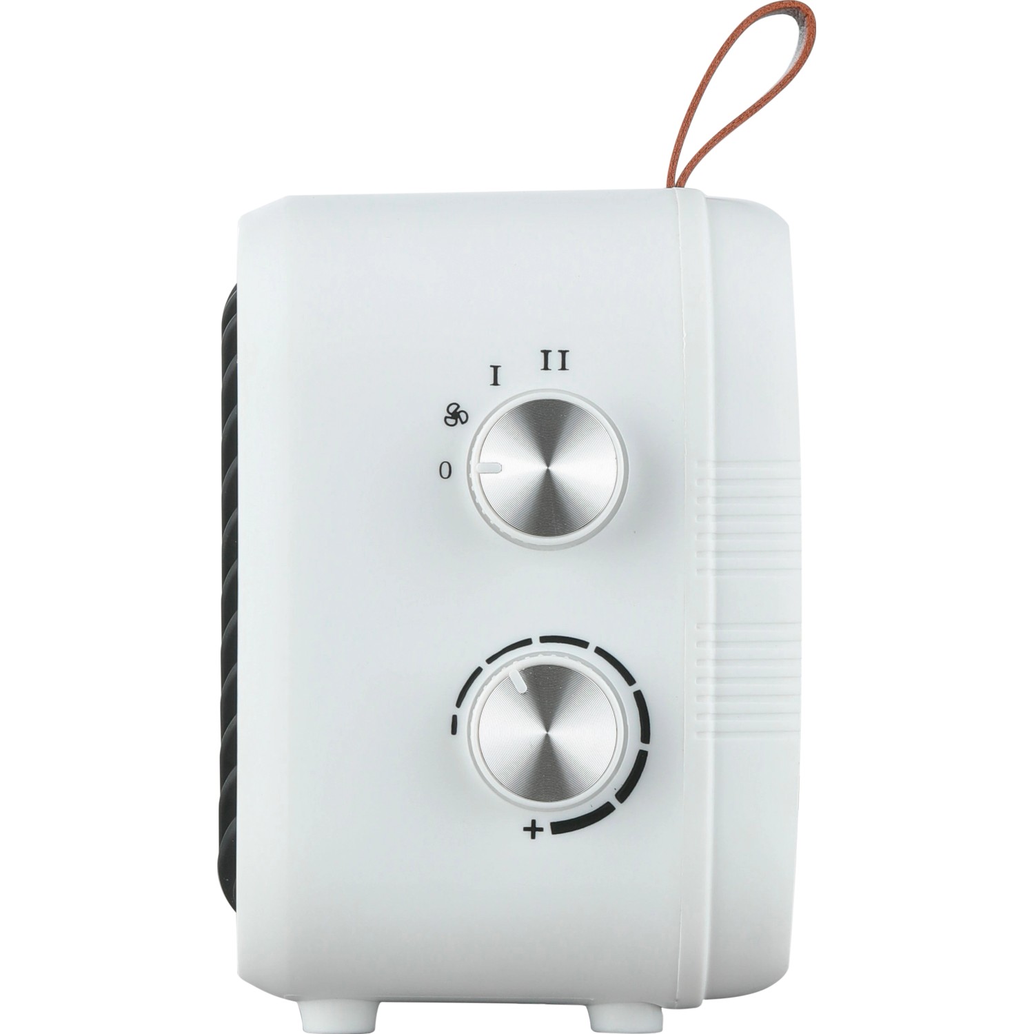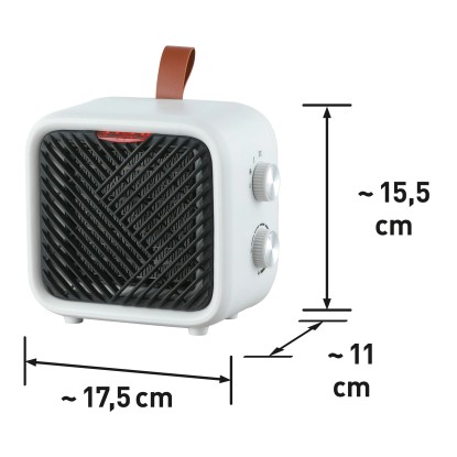 A kerámia hősugárzó háza strapabíró és modern formatervet kínál. Kompakt, kb. 17,5 cm x 15,5 cm méretének köszönhetően gond nélkül elhelyezhető az íróasztalon, a padlón vagy kis fülkékben. Ügyeljen arra, hogy a fűtőkészülék és a bútorok, függönyök stb. között felül és oldalt betartsa az 50 cm-es, illetve elöl a 120 cm-es biztonsági távolságot. Kis súlyának és méreteinek, valamint a praktikus huroknak köszönhetően könnyen szállítható egyik helyiségből a másikba, így mindig ott fűthet vagy szellőztethet, ahol szüksége van rá.