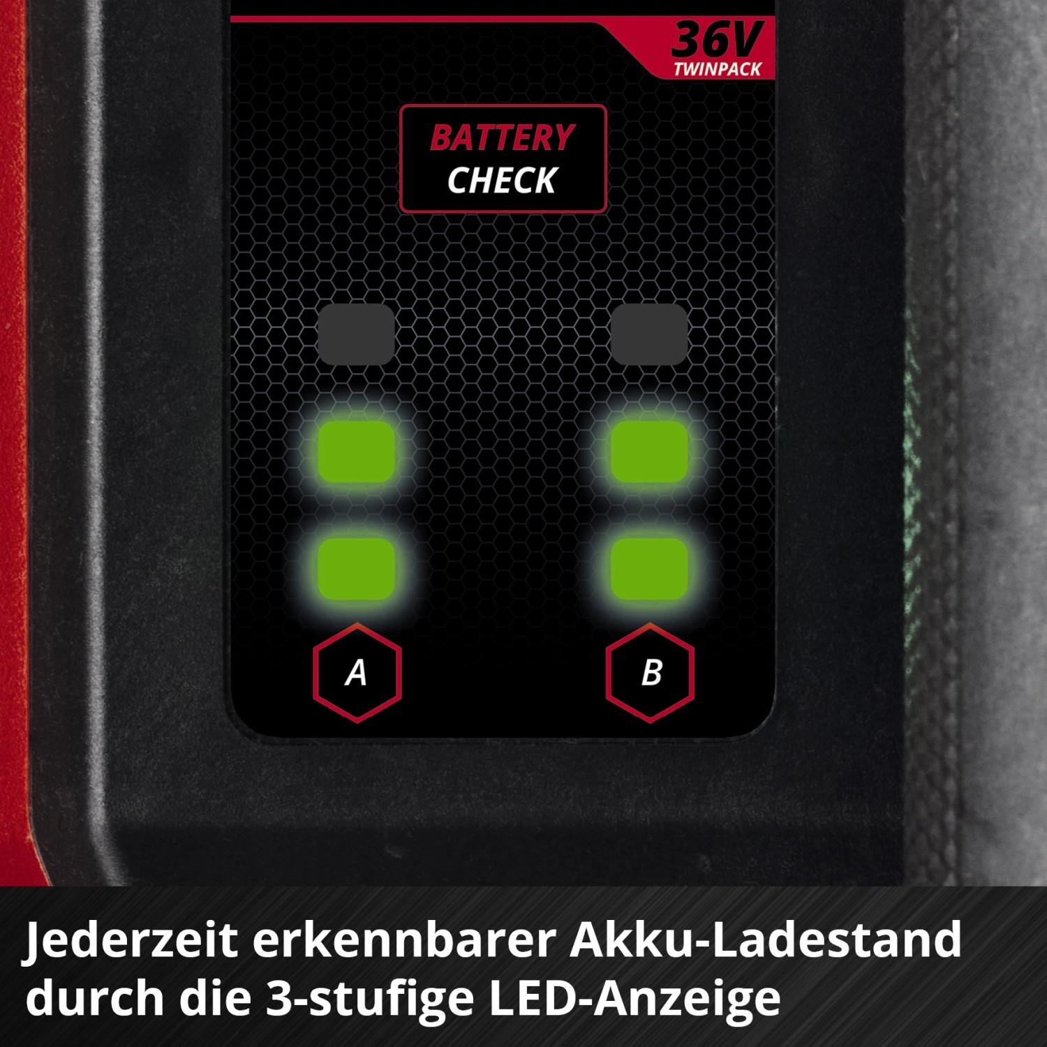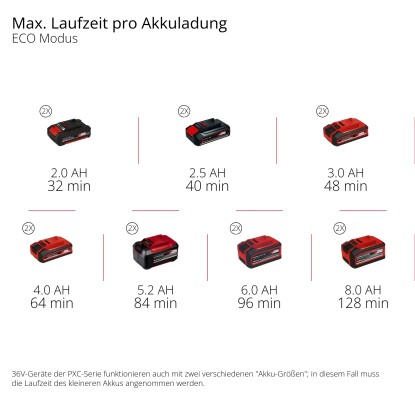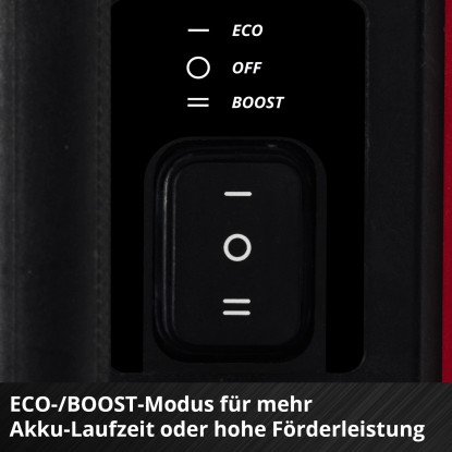 A LED-es töltöttségi szintjelzőn a két akkumulátor kapacitása bármikor látható. A kerti szivattyú két teljesítménymóddal rendelkezik: Boost üzemmóddal a maximális szállítási teljesítményért és Eco üzemmóddal a maximális akkumulátor-élettartamért kisebb szállítónyomás mellett. Az akkumulátoros vízszivattyú óránként akár 3800 l víz szállítására képes.