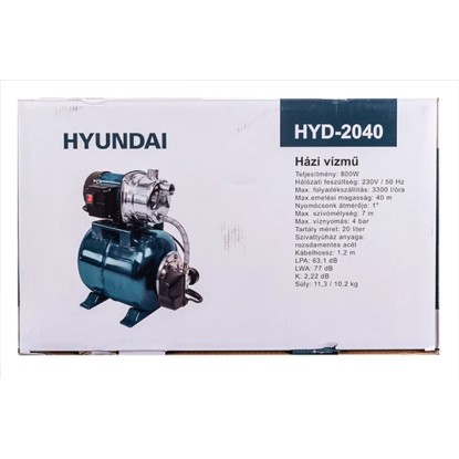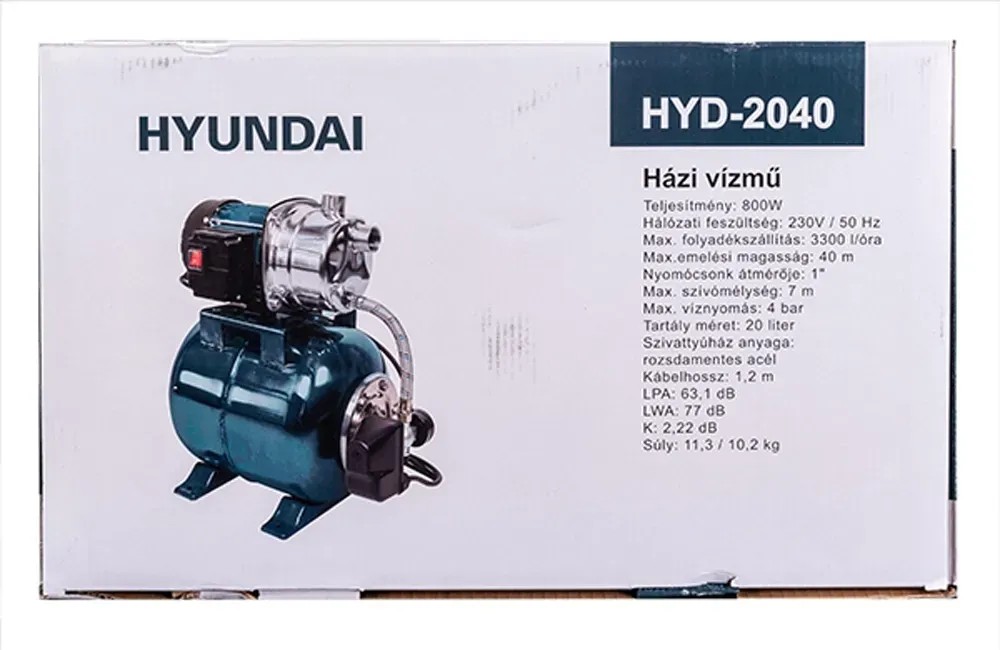 A Hyundai HYD-2040 szivattyúból, nyomáskapcsolóból, nyomásmérő órából és egy 20 literes fekvő tartályból áll.Dupla kifolyócsonkkal a könnyű telepítés érdekében, és egy nyomástartállyal, hogy csökkentse a vízkalapácsot a csőrendszerben.A házi vízmű állandó nyomást és automatikus indítást és leállítást biztosít, melyről a nyomáskapcsoló gondoskodik.A nyomástartály minimalizálja a ki és bekapcsolások számát, mivel a tartályban lévő vizet a szivattyú képes kiszivattyúzni, a motor beindítása nélkül, alacsony vízfogyasztáskor, vagy abban az esetben, ha valahol szivárgás van. A robosztus felépítésnek és korrózió mentes anyagoknak köszönhetően időtálló. Az önfeltöltő szivattyú biztosítja a stabil működést, mivel képes a levegő és víz keverékét is felszívni, míg a pumpa az optimális folyadék kondíciókat el nem éri.A szivattyúba beépített hőfokkapcsoló gondoskodik a túlmelegedés elleni védelemről, mely magas működési hőmérséklet esetén azonnal lekapcsolja a szivattyút. A motor levegőhűtéses, mely zárt, magas élettartamú csapágyakkal van felszerelve.