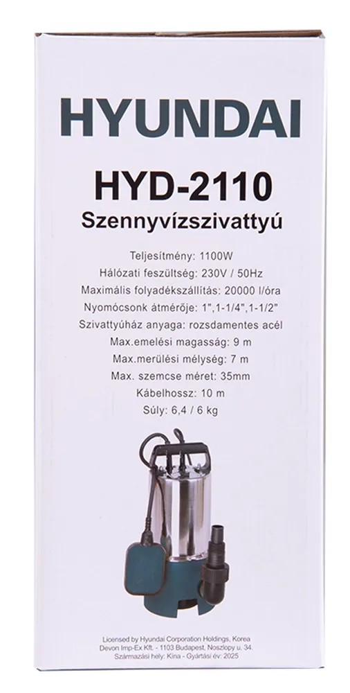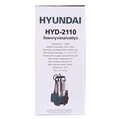 A Hyundai HYD-2110 1100 W-os motorral és rozsdamentes acél (INOX) házzal szerelt kerti merülő szivattyú, mely megbízható megoldást kínál tiszta víz mellett még szennyezőanyagot vagy lebegő részecskéket is tartalmazó víz szállítására. Fő felhasználási területük ásott kutak, tavak, elárasztott pincék, építési gödrök szennyezett vizének szivattyúzása.