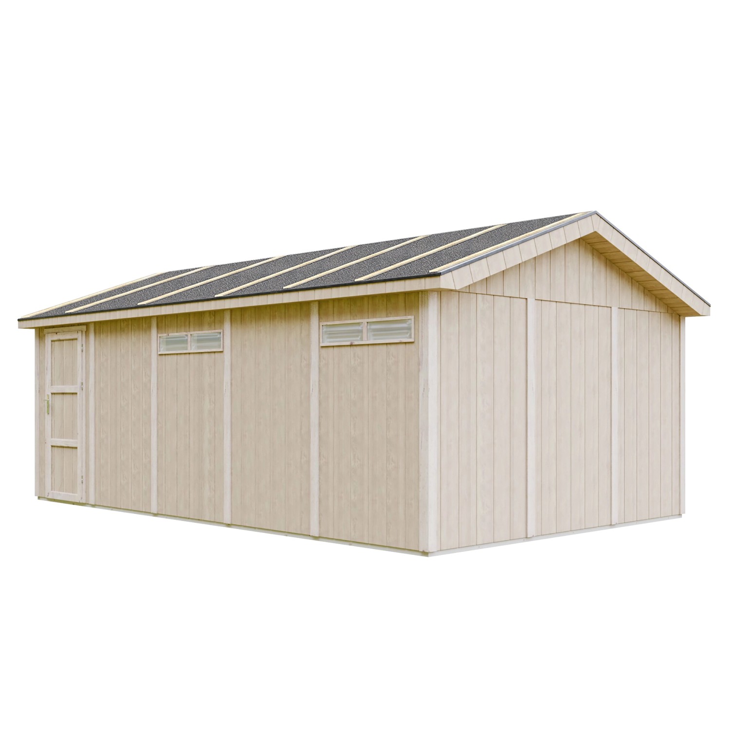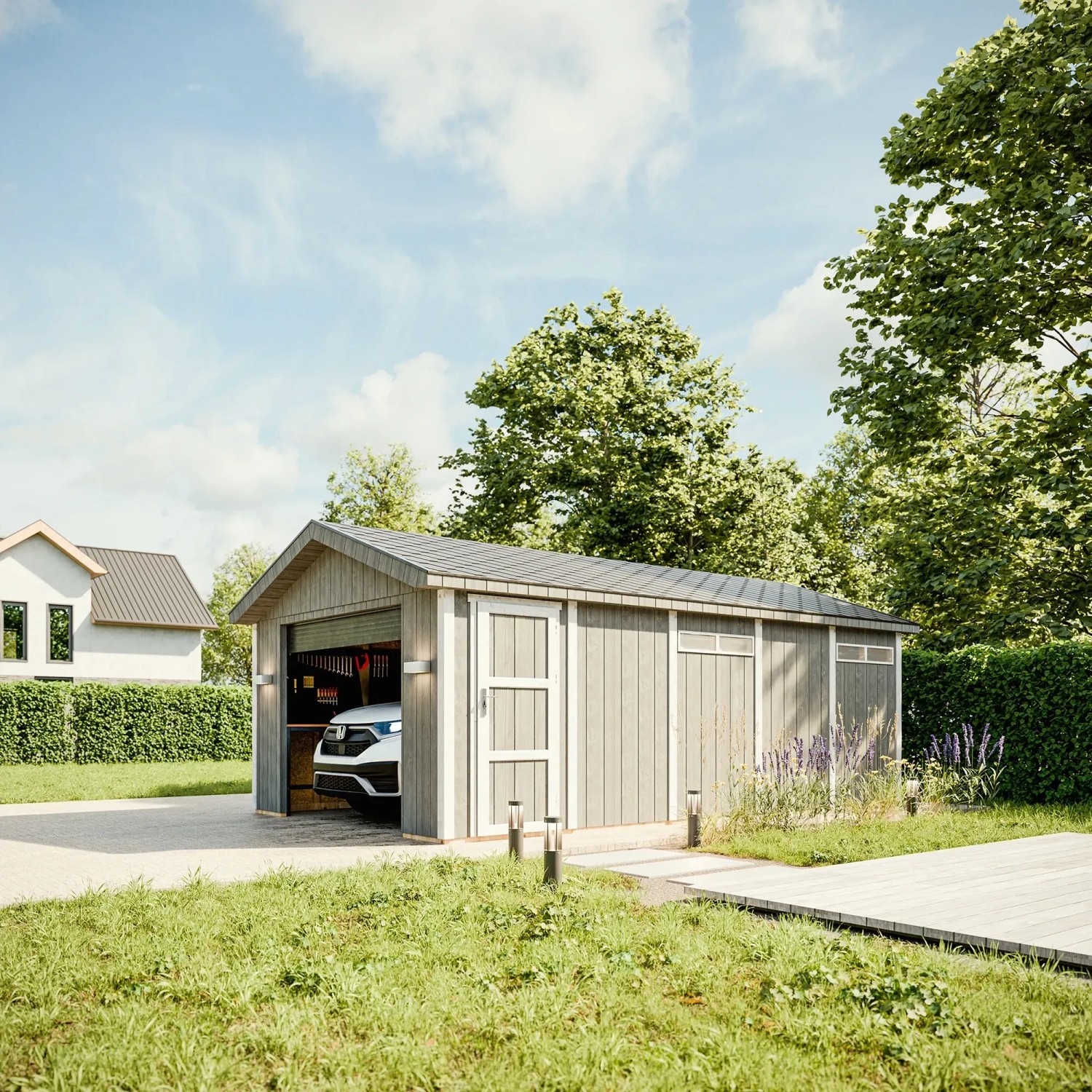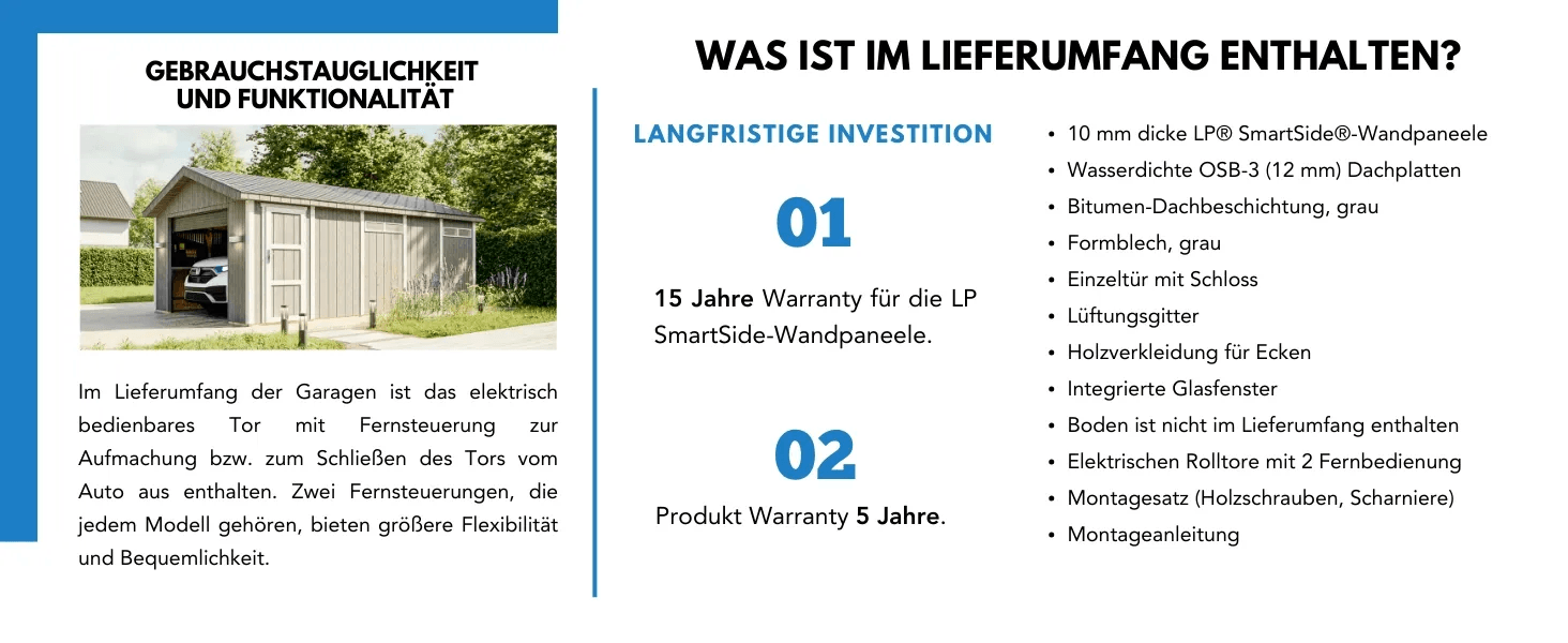 A garázs stabil és biztonságos tárolást biztosít a járművek és kerti gépek számára. A masszív 60 x 30 mm-es keret még nagyobb stabilitást biztosít a falaknak és a tetőnek, ami akár 120 kg/m2 teherbírást tesz lehetővé. A nagyobb kényelem érdekében a garázs szigetelhető is.