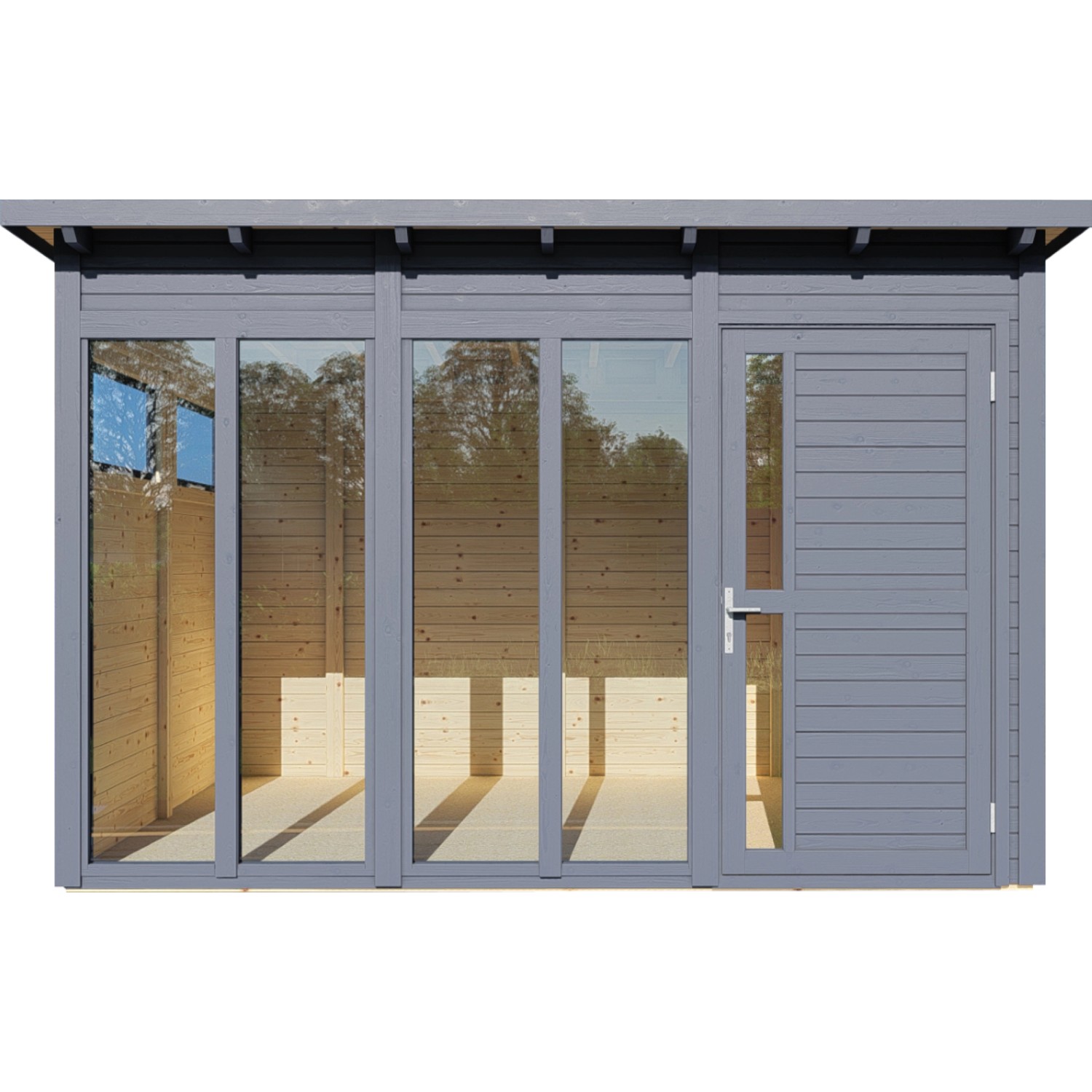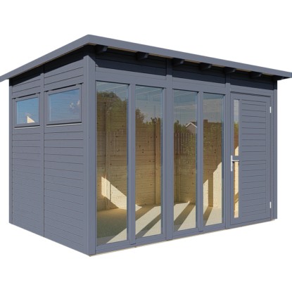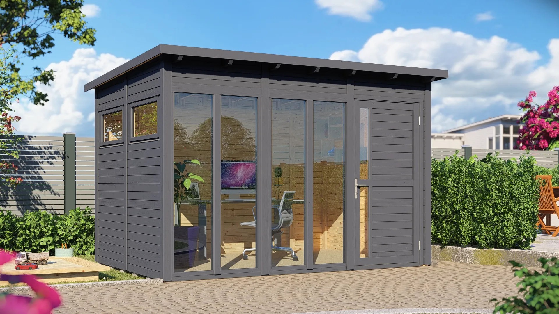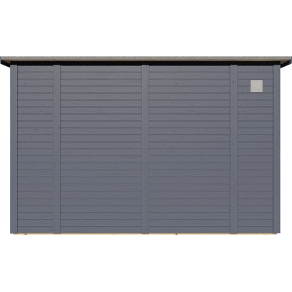 A 234 cm x 337 cm méretű, antracit színű Bertilo Pentus 3 Office kerti ház egy tágas kerti ház modern félnyeregtetővel. A padlóba süllyesztett dupla üvegezésű ablakok sok fényt engednek be a térbe, amelynek alapmérete kb. 7,9 m2. A biztonsági üvegből készült, egyszeresen üvegezett oldalablakok kinyithatók a szellőztetéshez