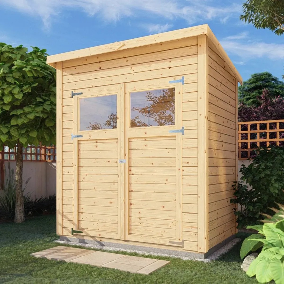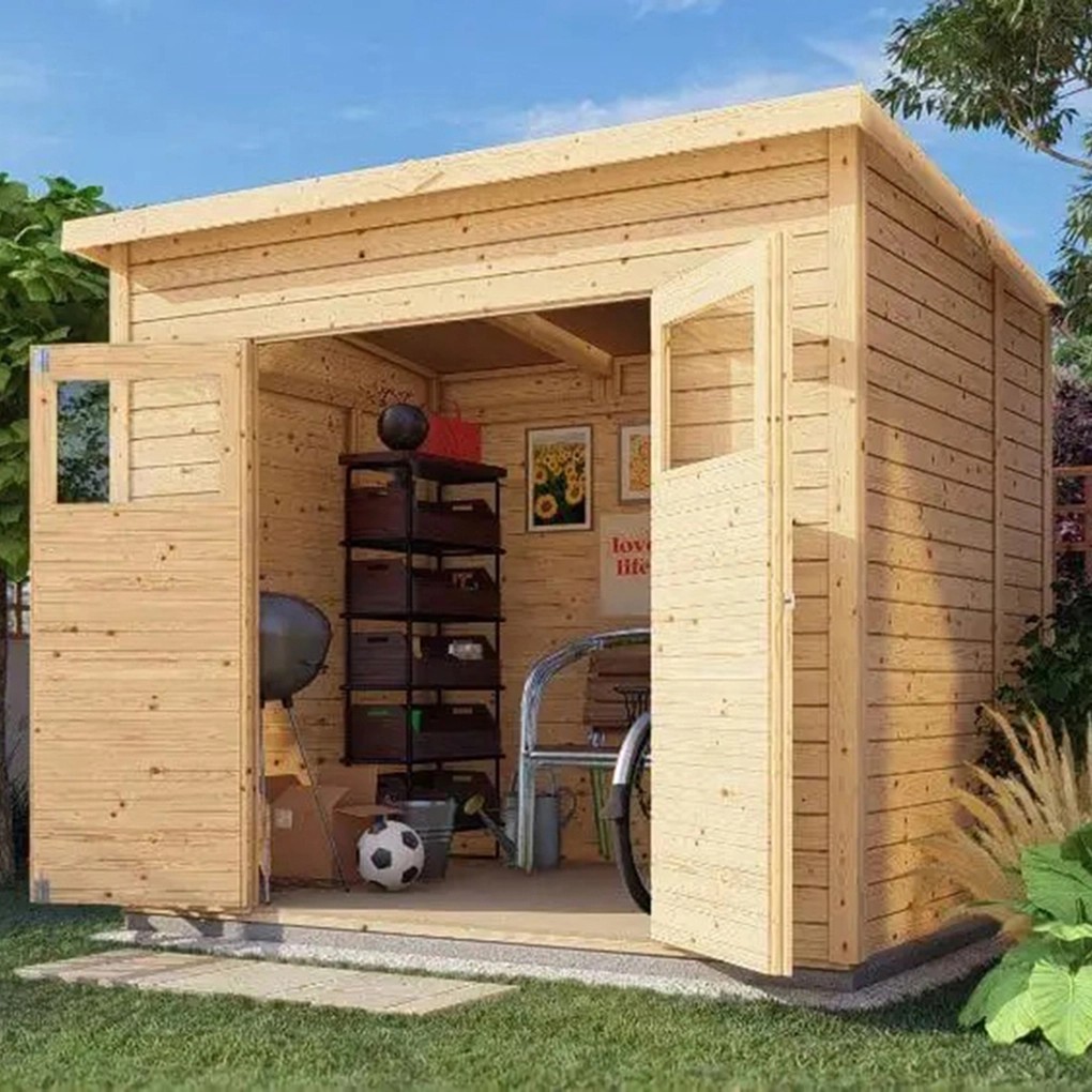 A Carlsson Mollie-14 fából készült kerti ház 2,2 m2 alapterületével és 4,15 m3 térfogatával a kerti eszközök elhelyezésére ideális. Annak érdekében, hogy kényelmesen beléphessen, kétszárnyú ajtóval rendelkezik, amely kb. 131 cm széles és 165 cm magas. A széles bejáratnak köszönhetően nagyobb kerti gépek, például fűnyírók és hasonlók, is elhelyezhetők benne.