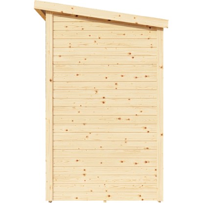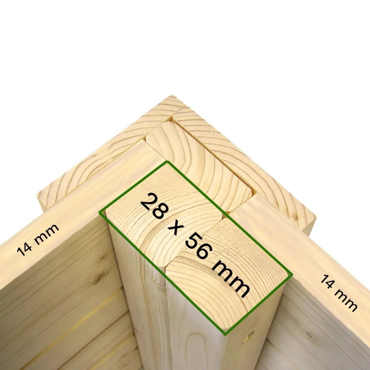 A 14 mm vastag fal különösen stabillá teszi a kerti faház szerkezetét. A mellékelt padló 16 mm-es multifunkciós lapelemekből áll. A 12 mm-es hornyolt lapokból álló lapostető maximálisan 85 kg/m2 hóterhelést bír el. A 8°-os dőlésszöggel rendelkező, speciális félnyeregtető formának köszönhetően a kiváló minőségű tetőfedődeszkák különösen alkalmasak tetőfedésre. Az elemes felépítésnek köszönhetően az összeszerelés nagyon egyszerű, és a hagyományos faállványos szerkezeten alapuló körbefutó keretek, amelyek az elemkötéseknél duplán meg vannak erősítve, nagy statikus terhelhetőséget biztosítanak.