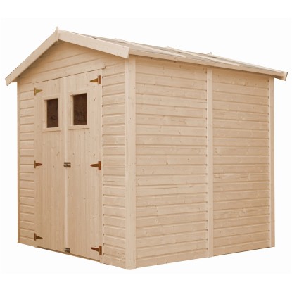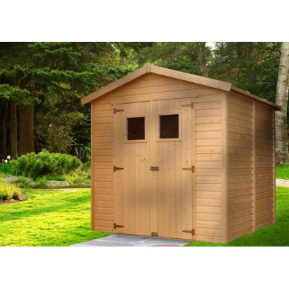 A kerti ház kezeletlen fából készült modulelemekből áll. A natúr felület faerezete természetes megjelenést biztosít. Az időjárás hatásai elleni védelem érdekében a felületet egyedileg festéssel vagy lazúrozással lehet kezelni. A szerszámosház szerkezete stabil, falvastagsága 17 mm. A nyeregtető maximális hóterhelése 30 kg/m2.