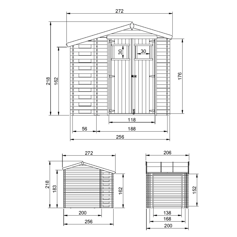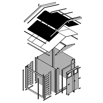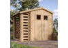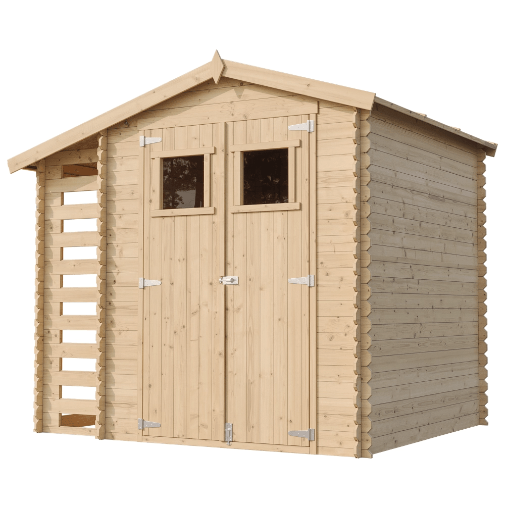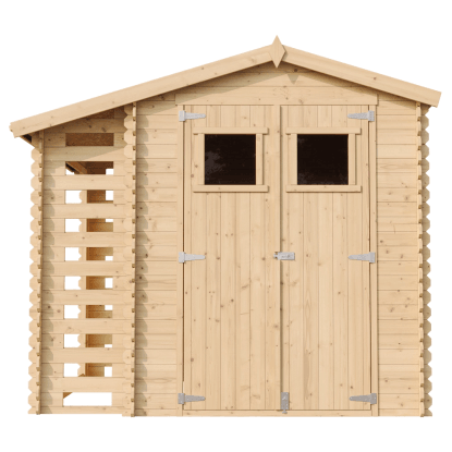 Időtlen formája, valamint a zárt fészer és a nyitott fatároló kombinációja révén ez a modell tökéletesen illeszkedik a különböző kertekbe. A bitumen bevonatú OSB-tető véd az időjárástól.