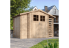 A zárt fészer és a két nyitott tárolóhely kombinációja funkcionális és letisztult megjelenésű. A bitumen bevonatú időjárásálló OSB tető megbízható védelmet nyújt az esővel és a hóval szemben. Ez a kerti ház nagy kertekhez ideális, és rengeteg tárolóhelyet kínál.
