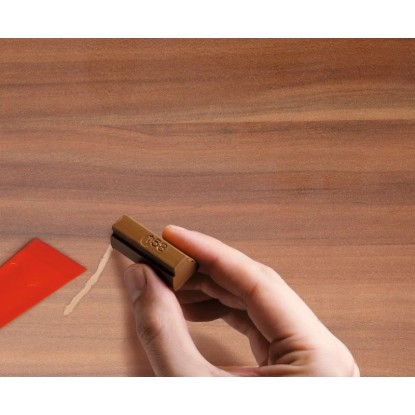 Bútorjavító viaszkészlet bútorokon vagy más függőleges vagy vízszintes fafelületeken keletkezett repedések és lyukak kitöltésére és javítására. A különféle viaszárnyalatok keverésével a fa textúrája tökéletesen utánozható. A puha viaszok ásványi viaszok keverékéből állnak, és földből, illetve oxidációból származó pigmentekkel vannak színezve. Elérhető 10 különböző kiszerelésben, csomagonként 3 különböző színnel és egy műanyag spatulával. Használati utasítás: Tisztítsa meg a felületet és távolítsa el a laza részeket a spatulával. Lágyítsa meg a viaszt melegítéssel (pl. radiátoron). Töltse fel az alapszínt: használjon olyan színes viaszt, amely a leginkább megegyezik a felület színével. Távolítson el egy kis mennyiségű bútorviaszt a spatula végével (vagy közvetlenül használja a színes viaszt), töltse bele a sérülés mélyedésébe, majd simítsa el. Tökéletesítse a színt: finoman kenjen bele egy sötétebb vagy világosabb bútorjavító viaszt az alap színbe. Tipp: A viaszolvasztó hegyével karcolja az alapba a fa erezetét. Tisztítás: Ha a sérült terület túltöltődik a viasszal, simán távolítsa el a felesleget az olvasztóról.
