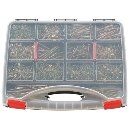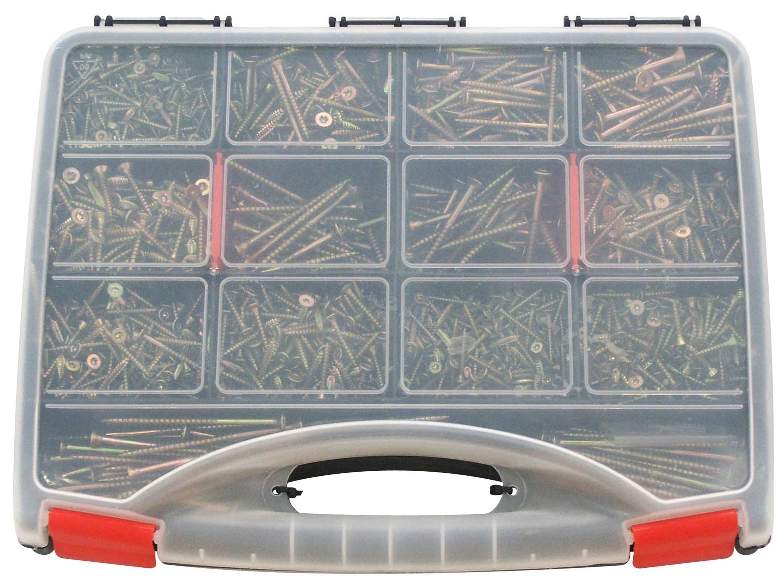 A praktikus csavarkofferben 1700 darabos válogatást talál különböző méretű forgácslapcsavarokból.