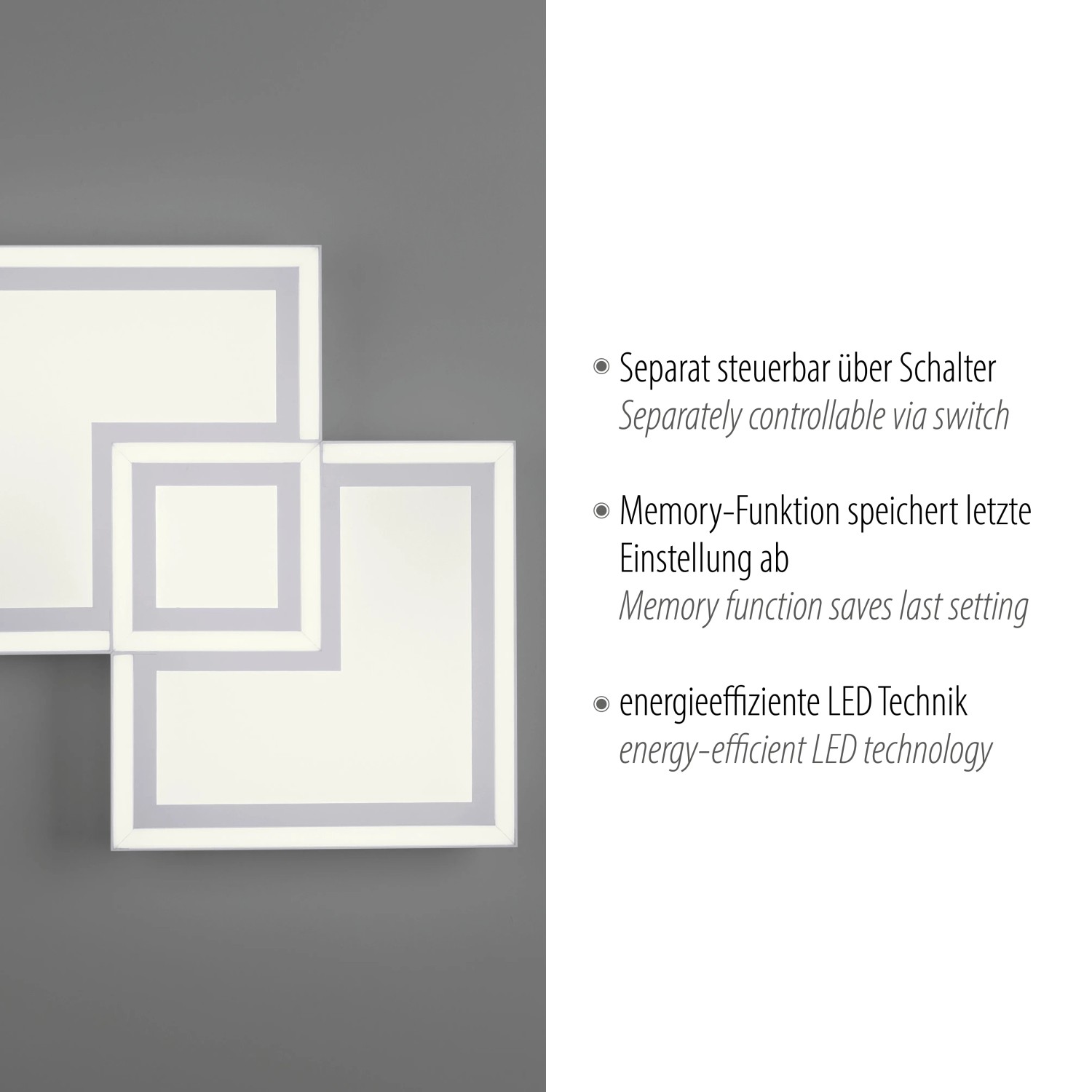 A mennyezeti lámpa különleges funkciója a soros kapcsoló, amellyel a fényforrások külön vezérelhetők. Az első be- és kikapcsoláskor a teljes mennyezeti világítás felragyog. A második alkalommal csak a lámpatest külső széle világít, a harmadiknál pedig csak a mennyezeti lámpa belső része világít.