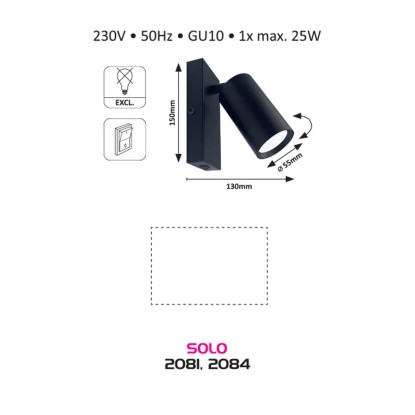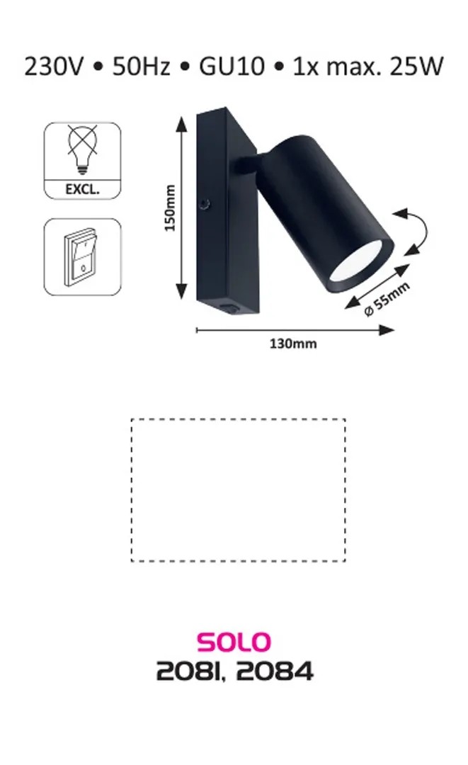 A minimál stílusú Solo egyes spotlámpa modern nappalink vagy hálószobánk berendezésének praktikus darabja lehet. A teljes egészében fémből készült, fehér színű modellt henger alakú búra és téglalap alakú dísztalp egészíti ki. A Solo a dísztalpon elhelyezett billenőkapcsoló segítségével működtethető. A spot lámpa egy darab, legfeljebb 25 W teljesítményű fényforrással használható, a foglalat típusa GU10. Ízléstől függően választhatunk hozzá meleg vagy természetes fehér fényű fényforrást. A Solo fali spotlámpa méretei a következők: szélessége 60 mm, magassága 150 mm, a búra átmérője 55 mm, a lámpa faltól mért távolsága 130 mm, beépítési átmérője 80 mm. Ezt a modellt fényforrás nélkül szállítjuk.