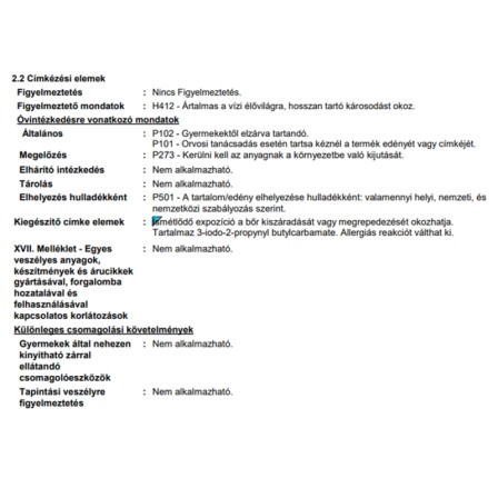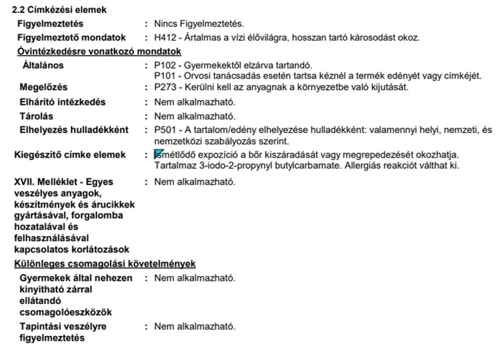 | Alk. gyermekjátékhoz (DIN EN 71-3 bevizsg.): | Gyermekjátékhoz nem alkalmas |