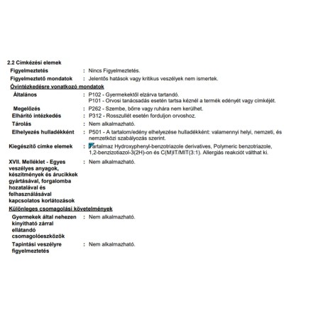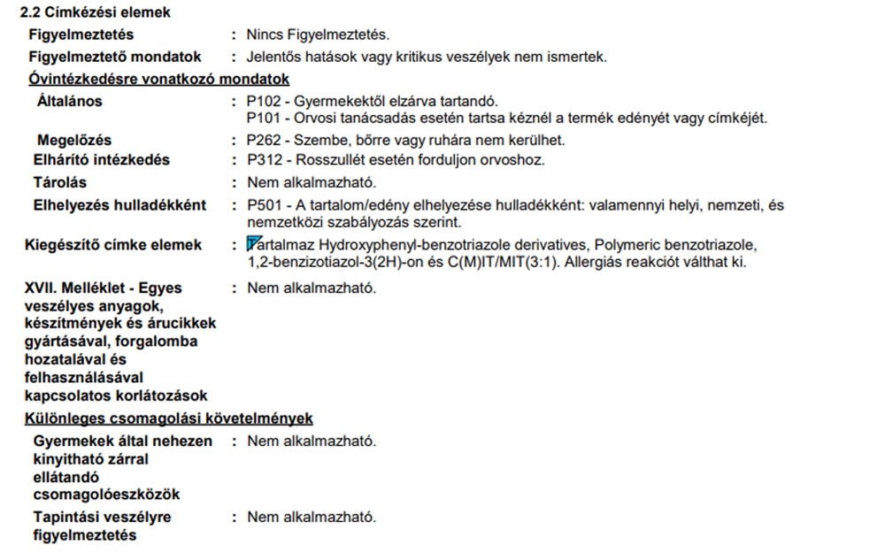 | Alk. gyermekjátékhoz (DIN EN 71-3 bevizsg.): | Gyermekjátékhoz nem alkalmas |